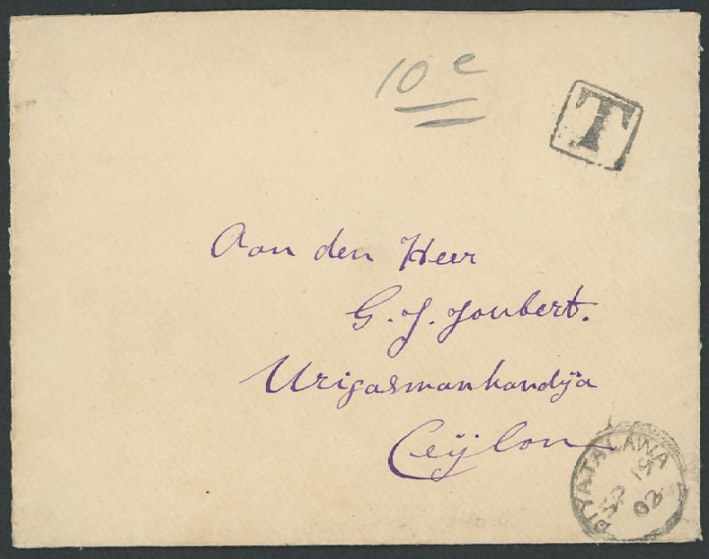1902 (Sep 19) inter-camp stampless cover with 'DIYATALAWA' cds & fancy 'T'-in-box handstamp, to "Urugasmanhandija" with Colombo
