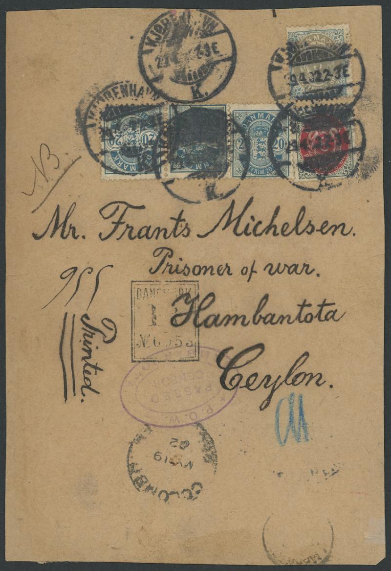 by over-inked Copenhagen cds, boxed 'DANEMARK/ R ' cachet below, Colombo transit cds of MY19/02, poor Hambantota arrival cds & light but clear double-oval 'POW/ PASSED/CENSOR/HAMBANTOTA' cachet in violet. Ex Kenneth Griffith. Rare registered Printed