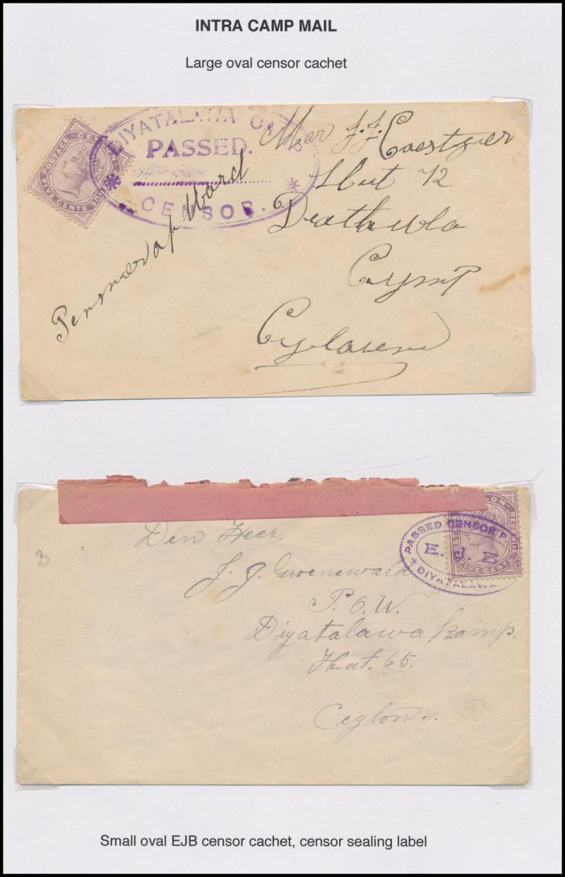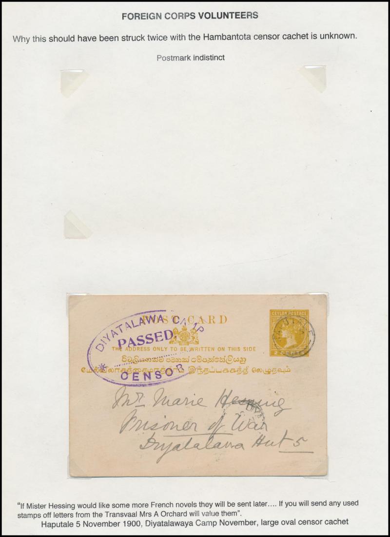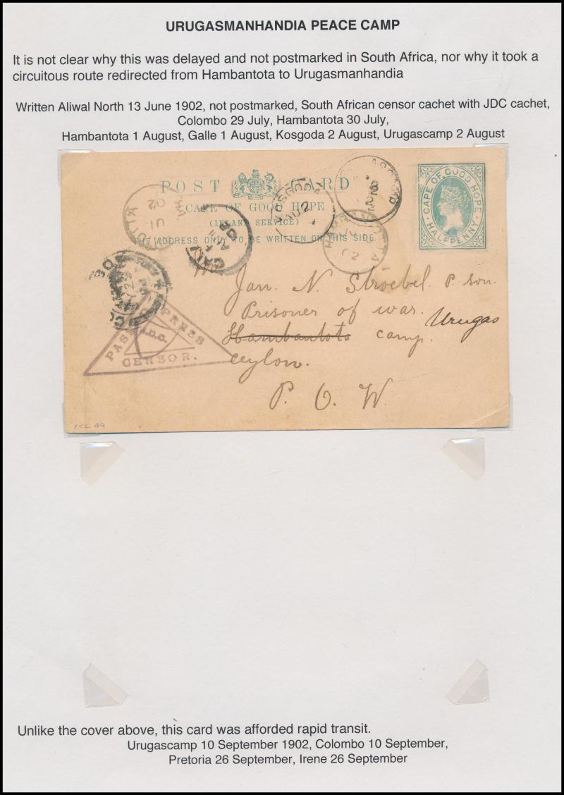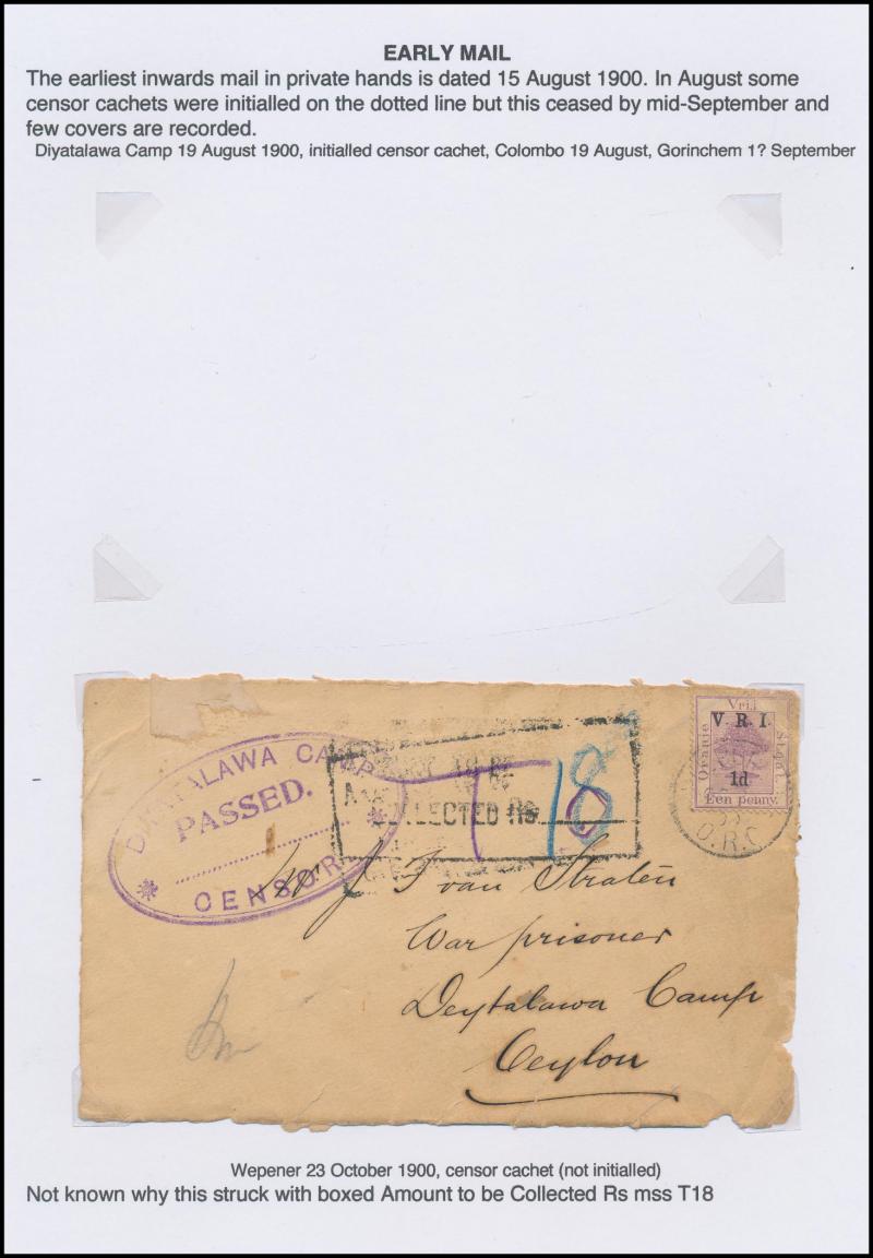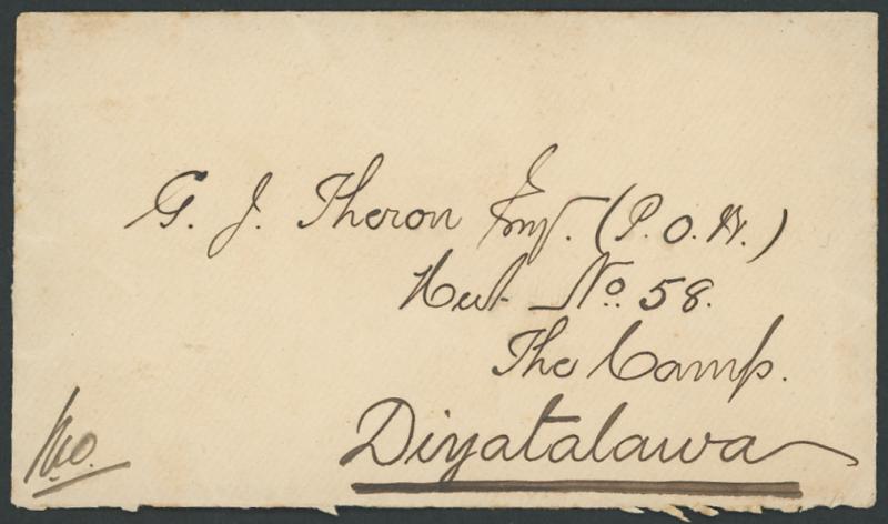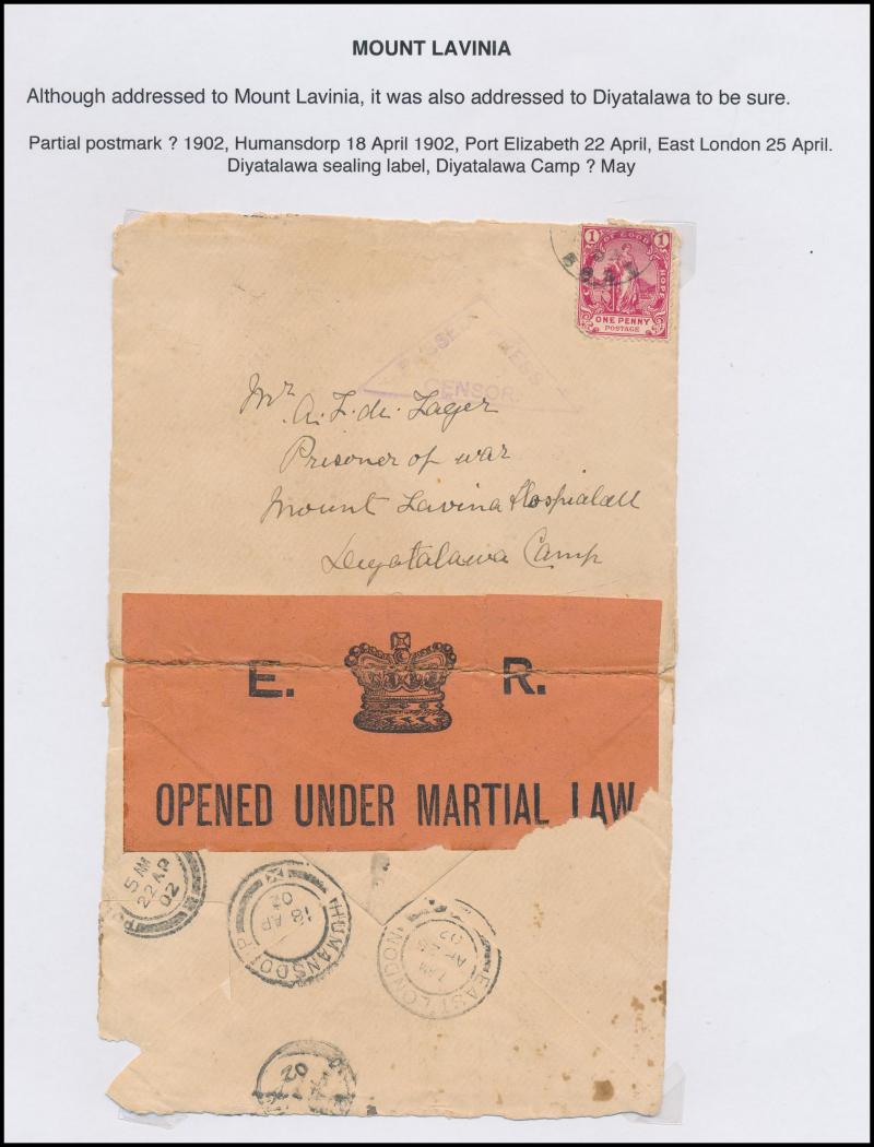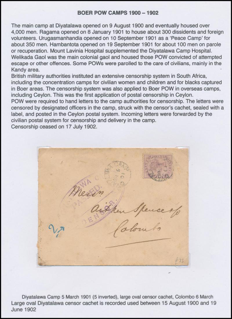 Camp/Diyatalawa", very fine. On 31.5.1902, signing of the Treaty of Vereeniging formally ended the Second Boer War. In Ceylon, censorship ended on 17.7.1902 & most of the POWs were released, the majority returning to South Africa, while others chose