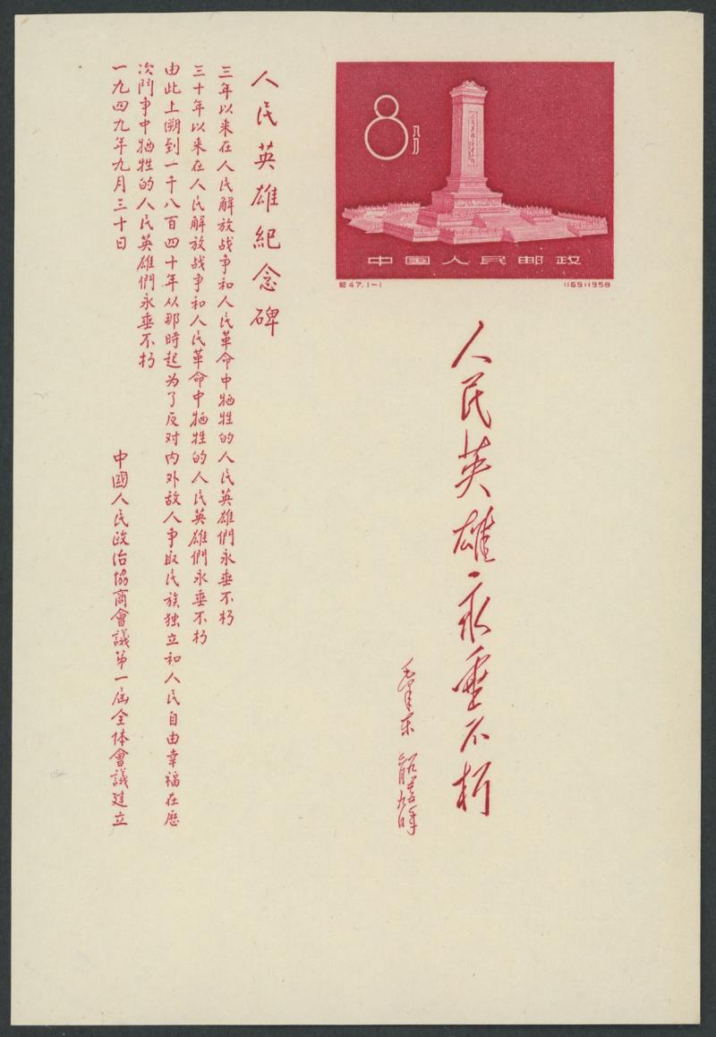 1958 People's Heroes Monument 8f red M/S SG 1749a, very light bend, without gum as issued, Cat £250. (Image1) (Image2)