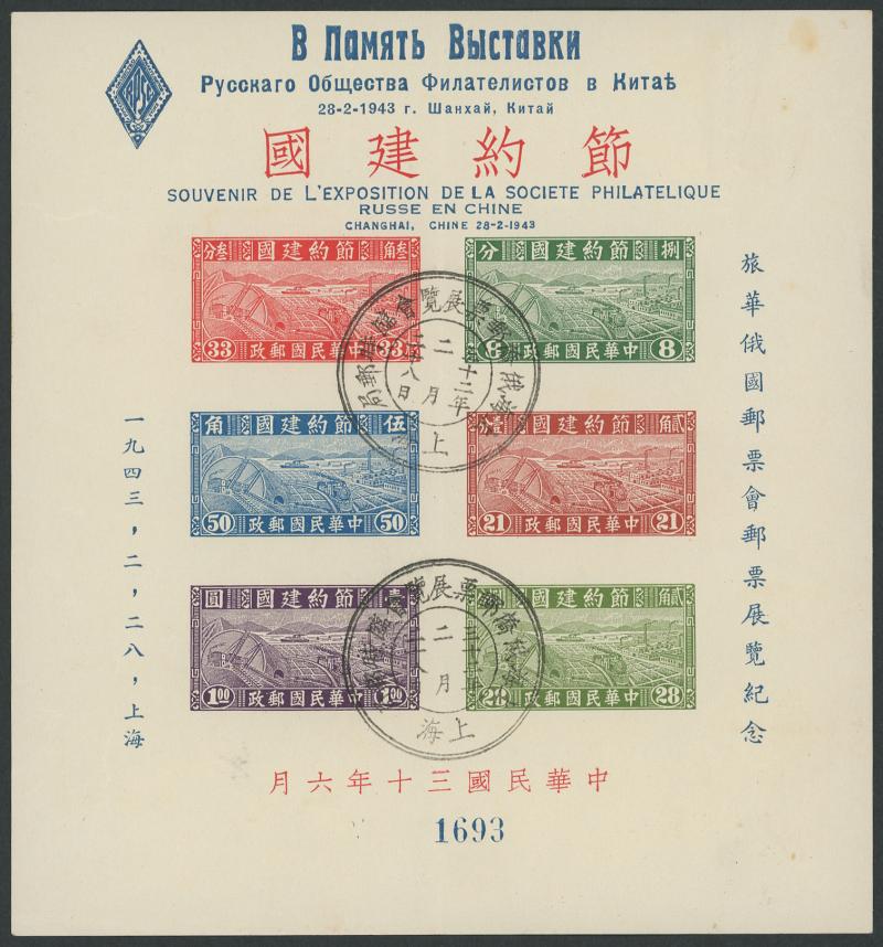 1941 Thrift Movement M/S SG 605 with Russian Philatelic Society, Shanghai exhibition overprint, CTO with commemorative cancel,