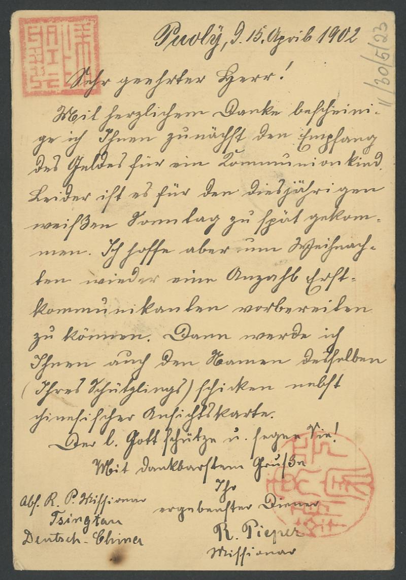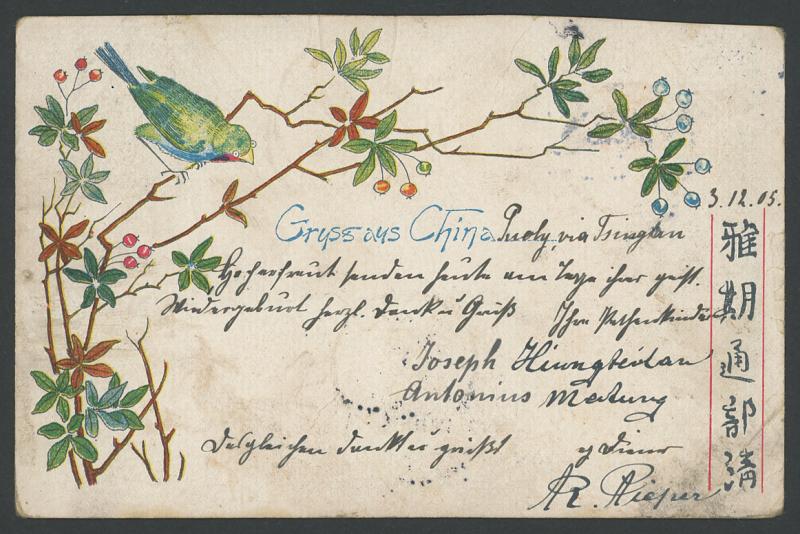 Tsingtau" and signed "R Pieper" (a German missionary), to Bavaria with 1c Coiling Dragon (just trimmed at top) tied by superb Chinese-characters cds & large 'chop' in red below, largely superb 'CHINAN' bilingual cds, Kiautschou 5pf affixed and tied
