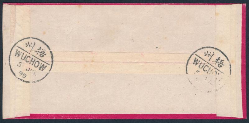 Customs, Wuchow" address and 'PRINTING!' endorsement, Small Dragons 1ca green and Red Revenue 'one cent' overprint (SG 88; Cat £275 for used) tied by two very fine strikes of '.../CANTON/4 JUL/99' cds cancels, equally very fine '.../WUCHOW/5 JUL/99'