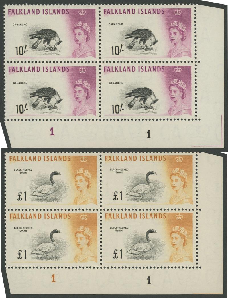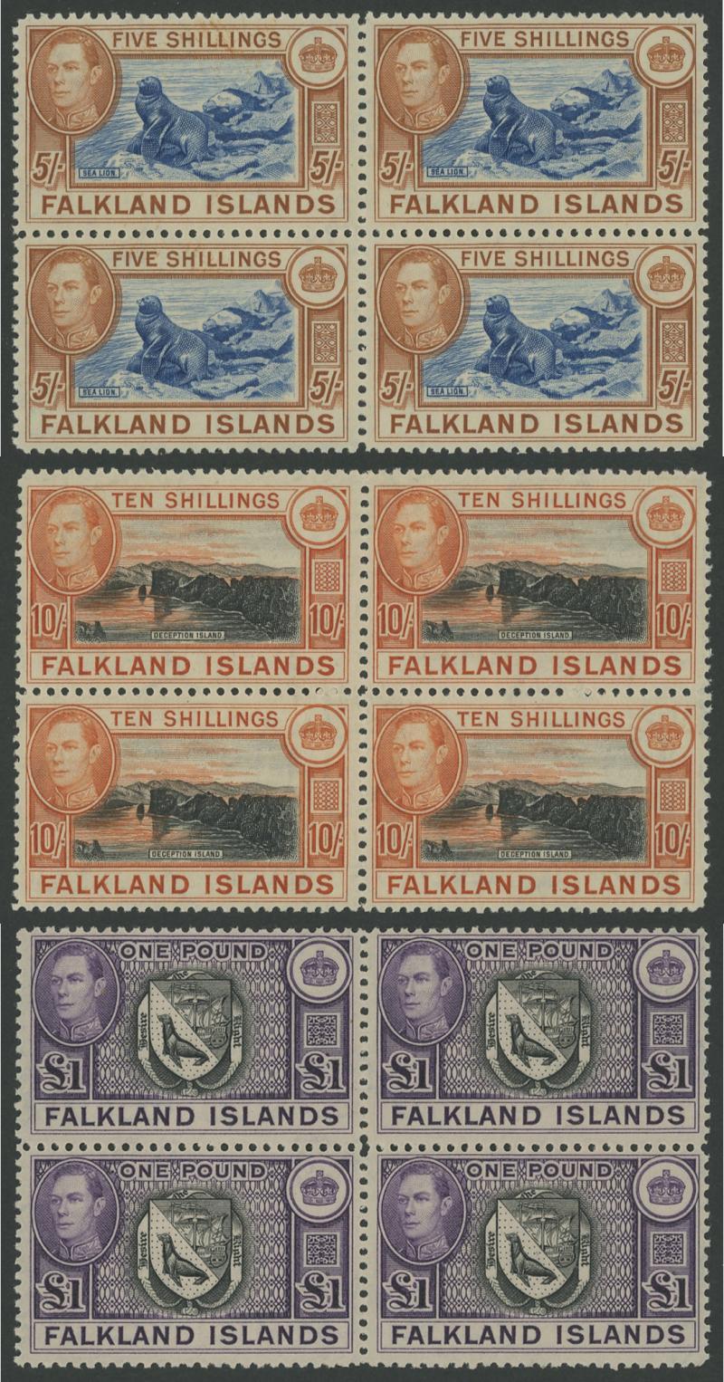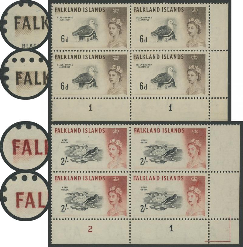 lower-right corner of the sheets, the lower-right unit in each block with Weak Entry below 'FA' of 'FALKLAND' [Plate 2 Pos R12/5] SG 193ab-195ab & 204ab, plus Waterlow Printings 6d block the lower-left unit with unlisted variety Flaw on 'F' of