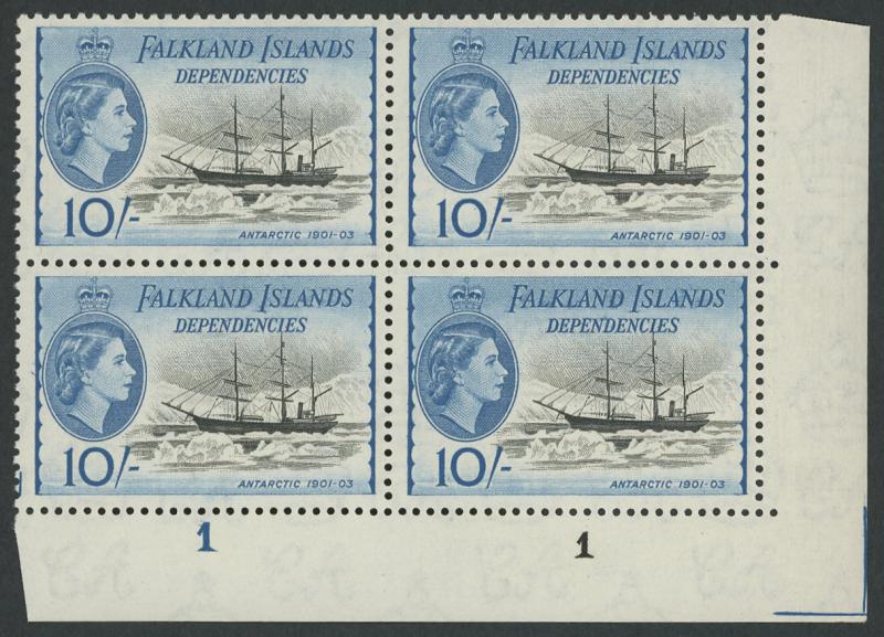 FALKLAND ISLANDS DEPENDENCIES: 1954-62 Ships 2/- to £1 SG G36-40 in marginal Plate Number blocks of 4 from the lower-right corner