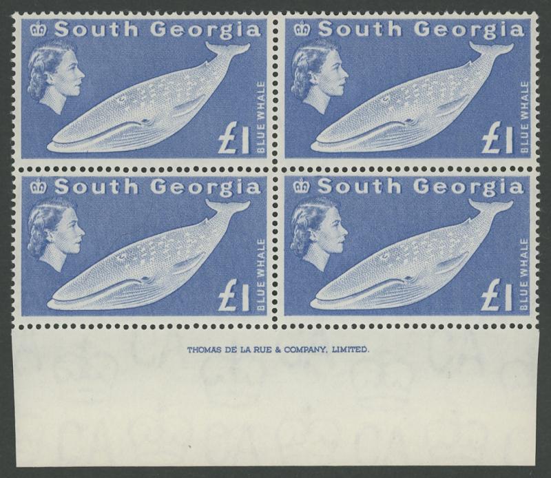 SOUTH GEORGIA: 1963-69 Pictorials ½d to to £1 ultramarine & £1 grey set SG 1-16 Thomas De la Rue Imprint blocks of 4 from the base