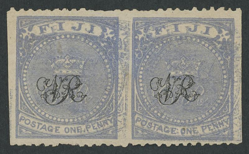 1876-77 Cakobau on Lithographed 'VR' Paper 1d blue Doubly Printed SG 28b horizontal pair Imperforate Vertically SG 28d, some