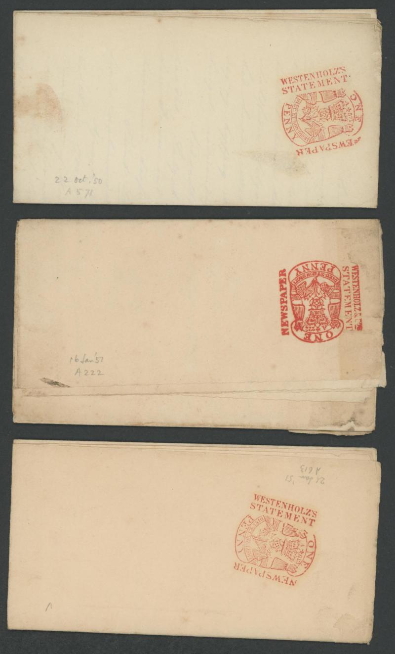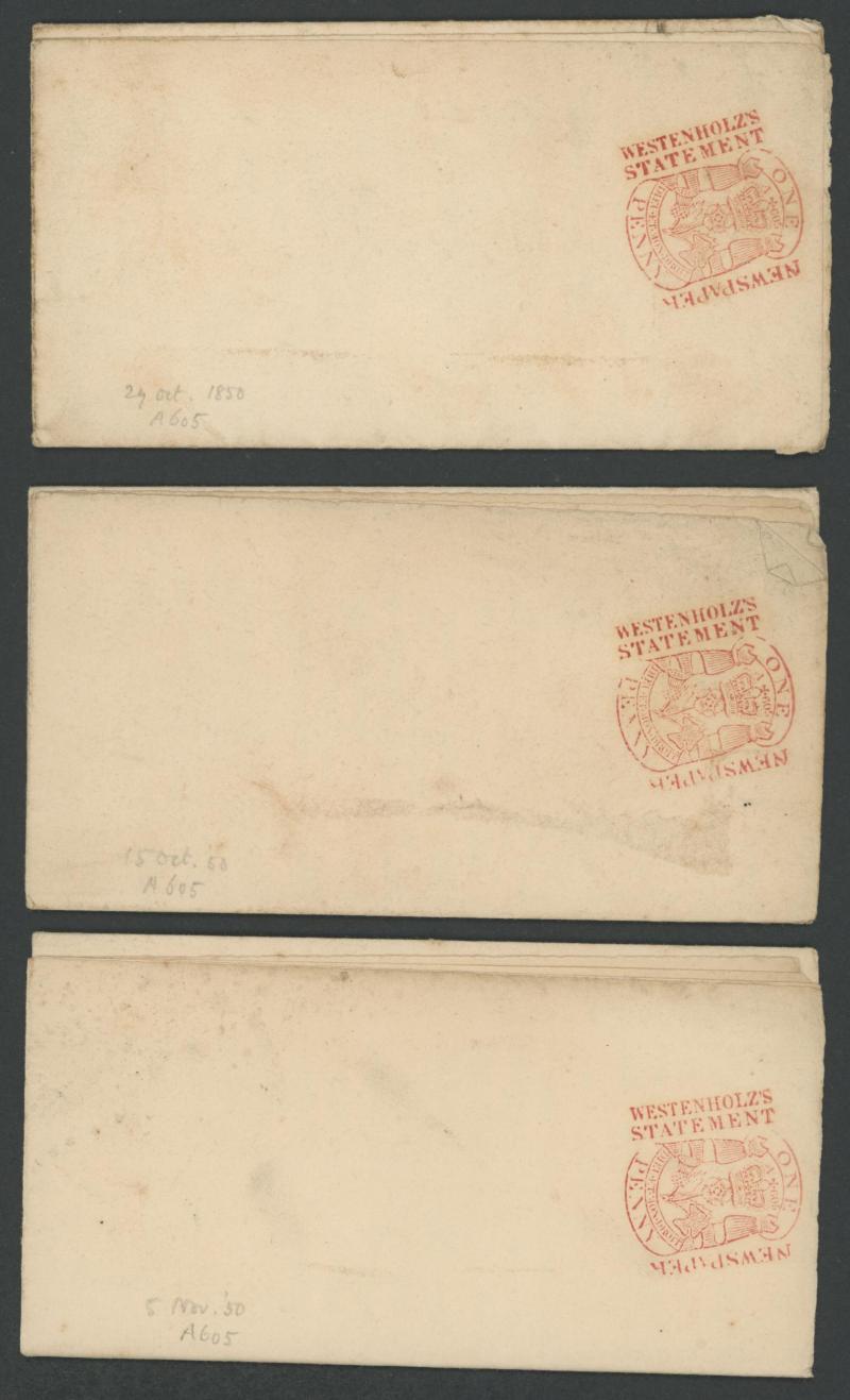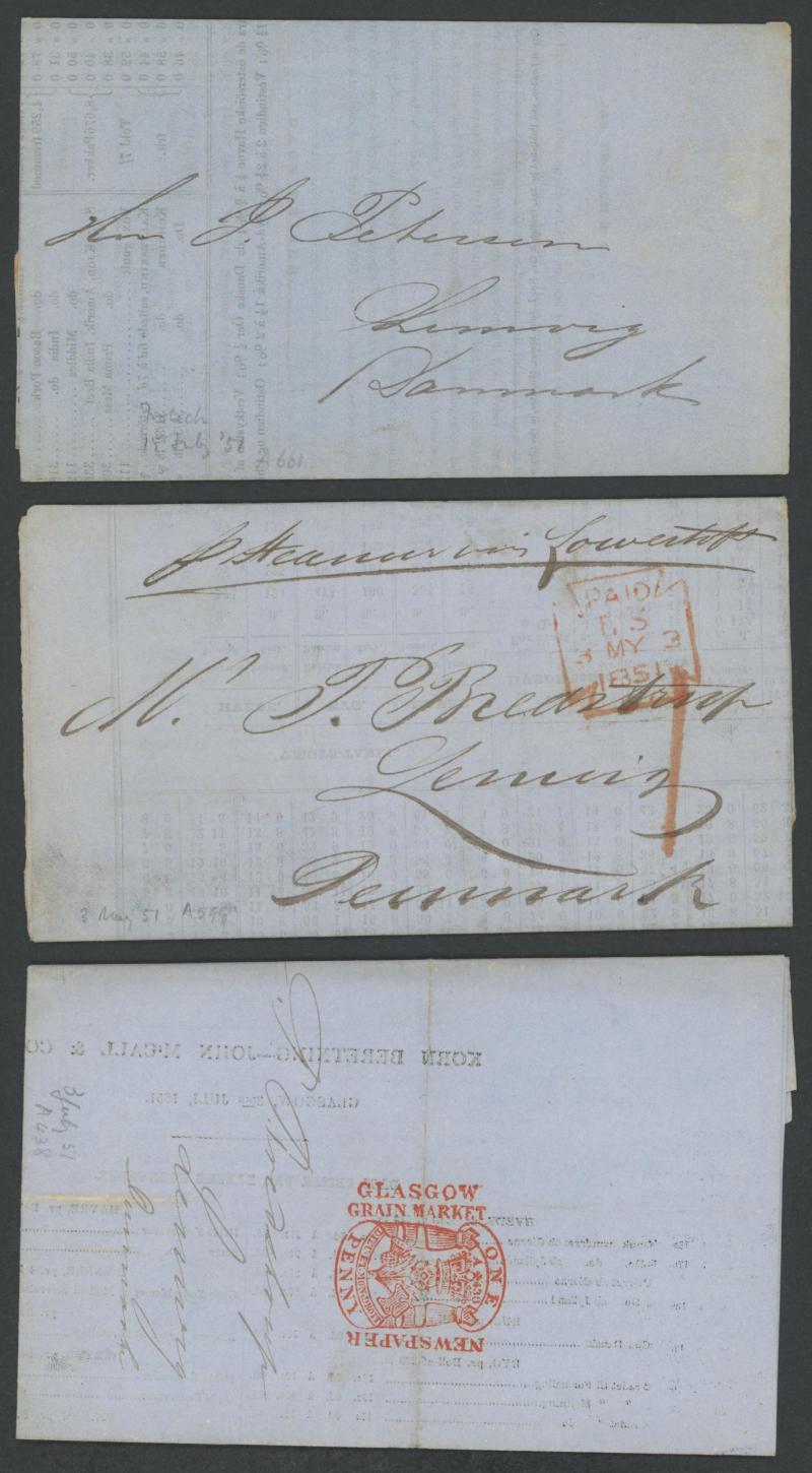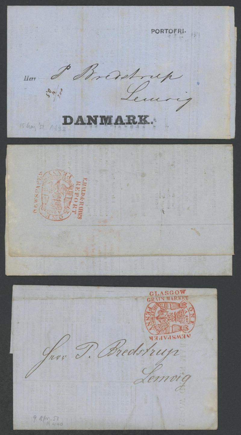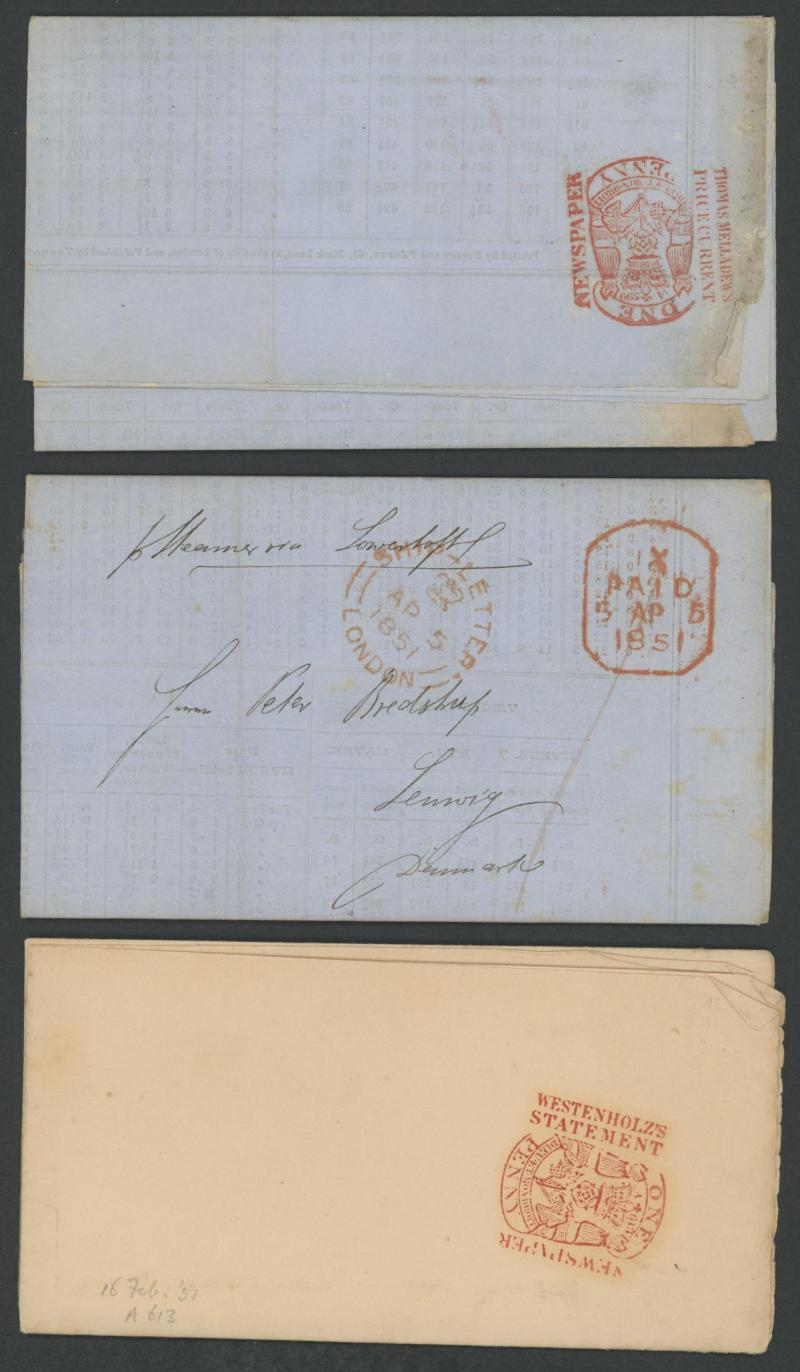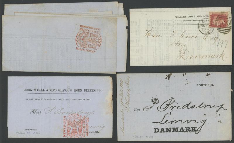 1850s batch of stampless printed Prices Current all to Denmark, each with Newspaper 1d handstamp in red on the reverse (mostly) for