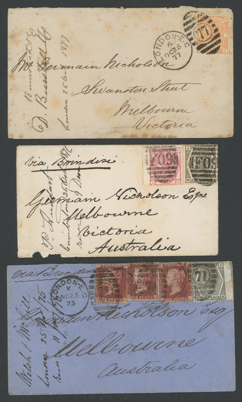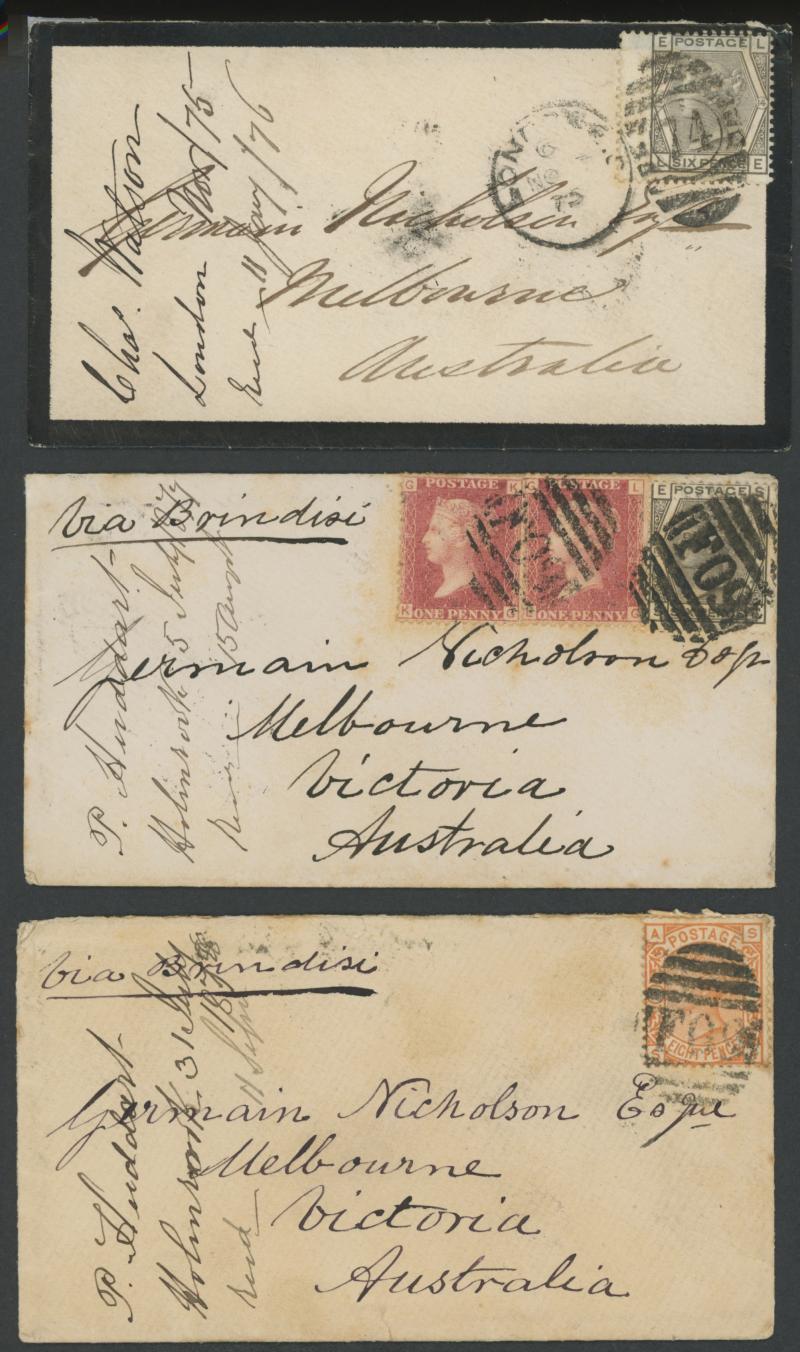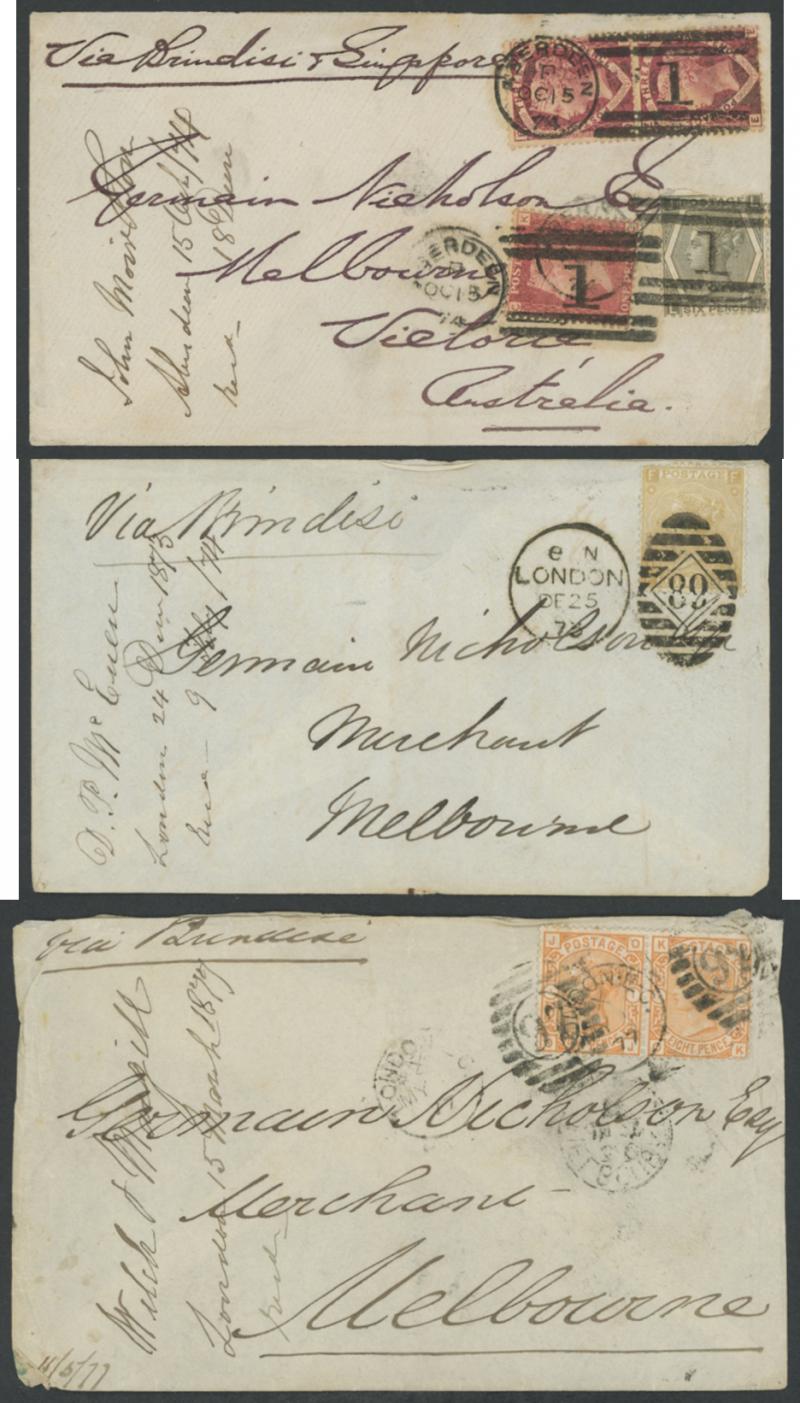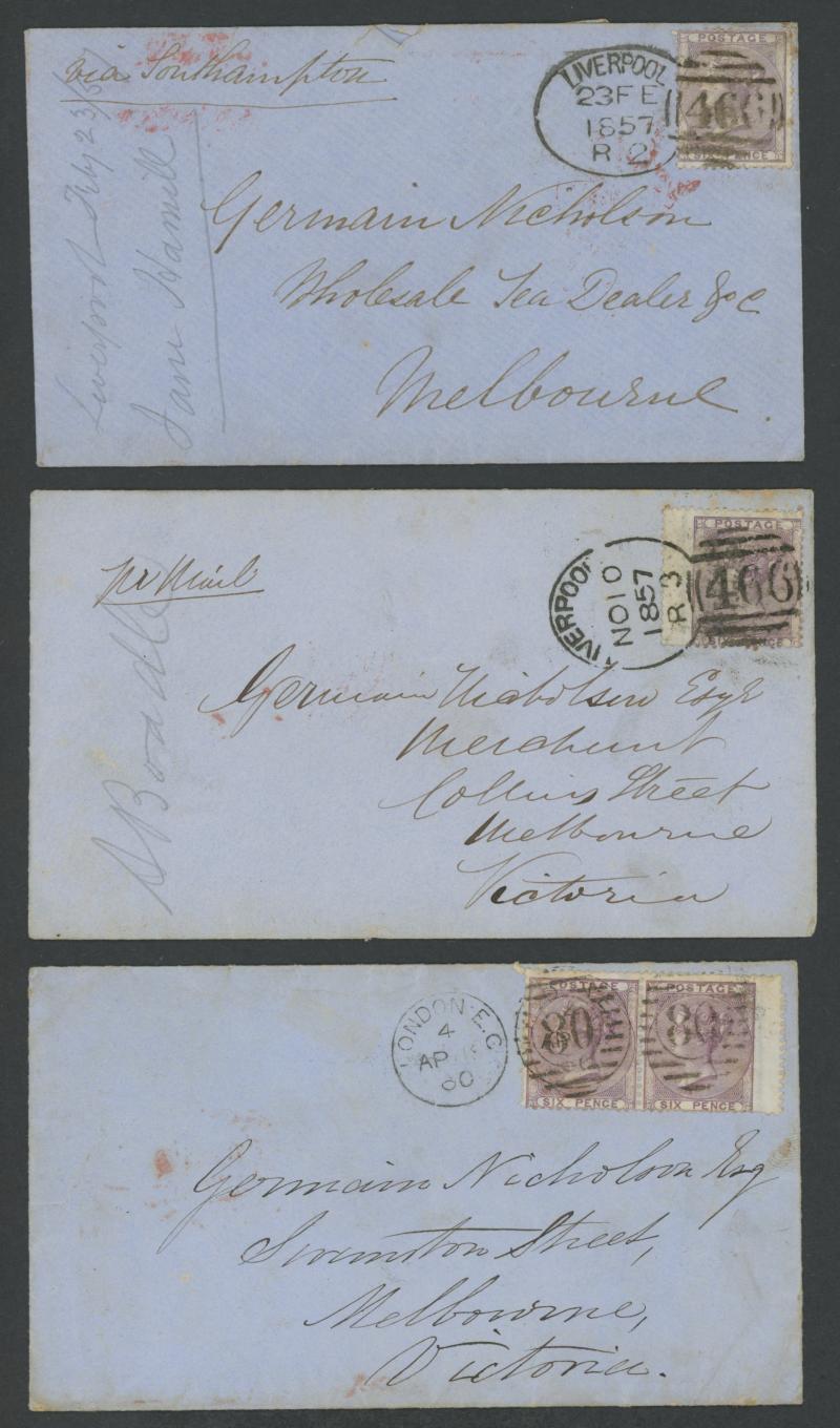 1857-78 covers to Melbourne merchant Germaine Nicholson at rates of 6d x4 (two with different Liverpool 'spoon' duplexes; one