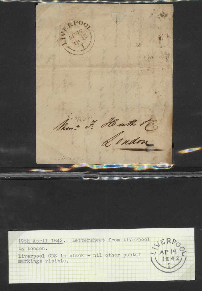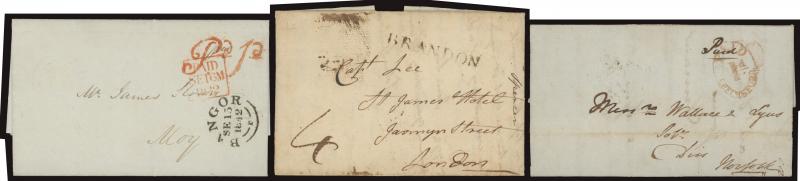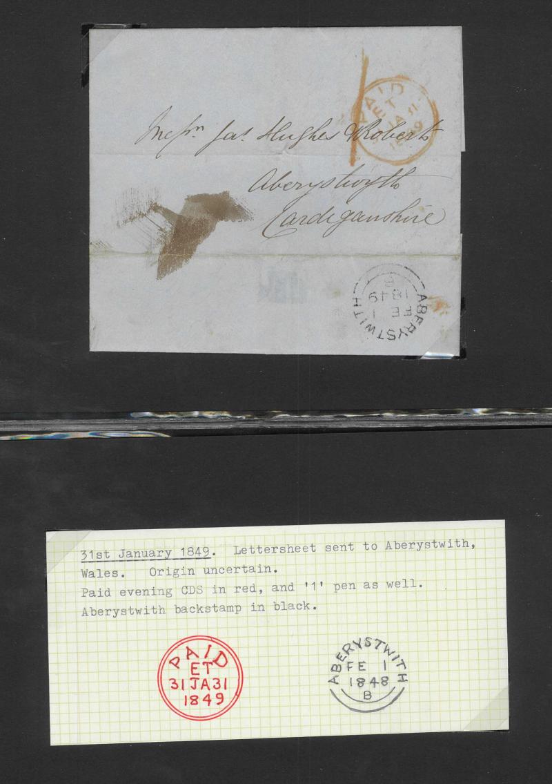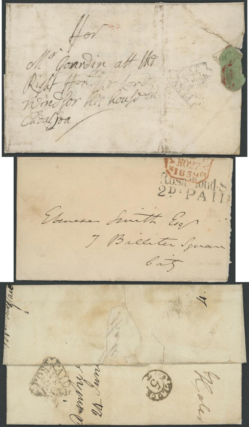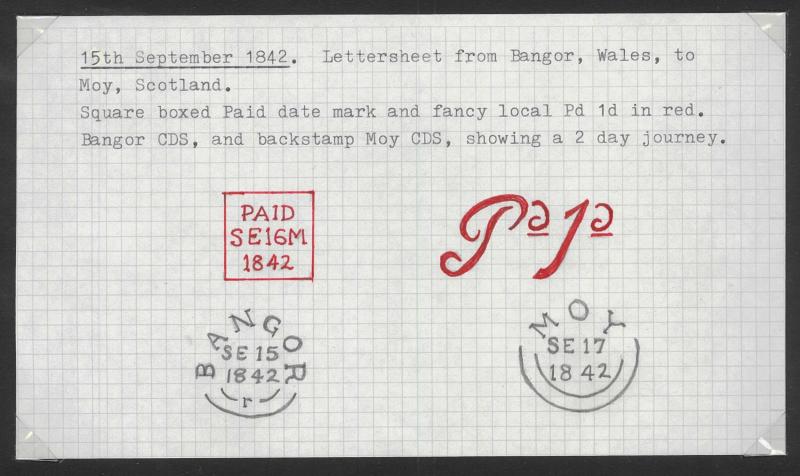 Park illustrated letter sheet endorsed "Pd 1" with superb 'TADCASTER' cds, 1839 with 'Rosamond S[t]/2D PAID' largely very fine strike (office not listed in 'Collect British Postmarks'), 1842 from Wales with superb 'BANGOR' in black & 'Pd 1d' h/s in