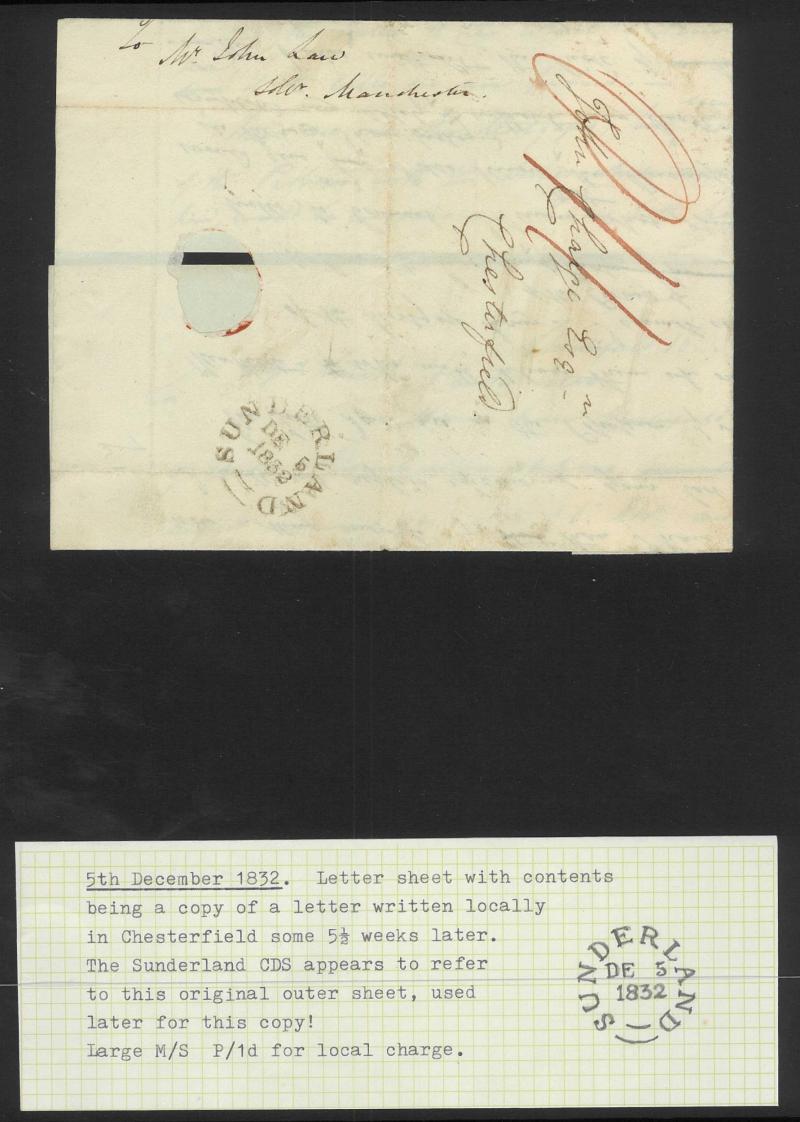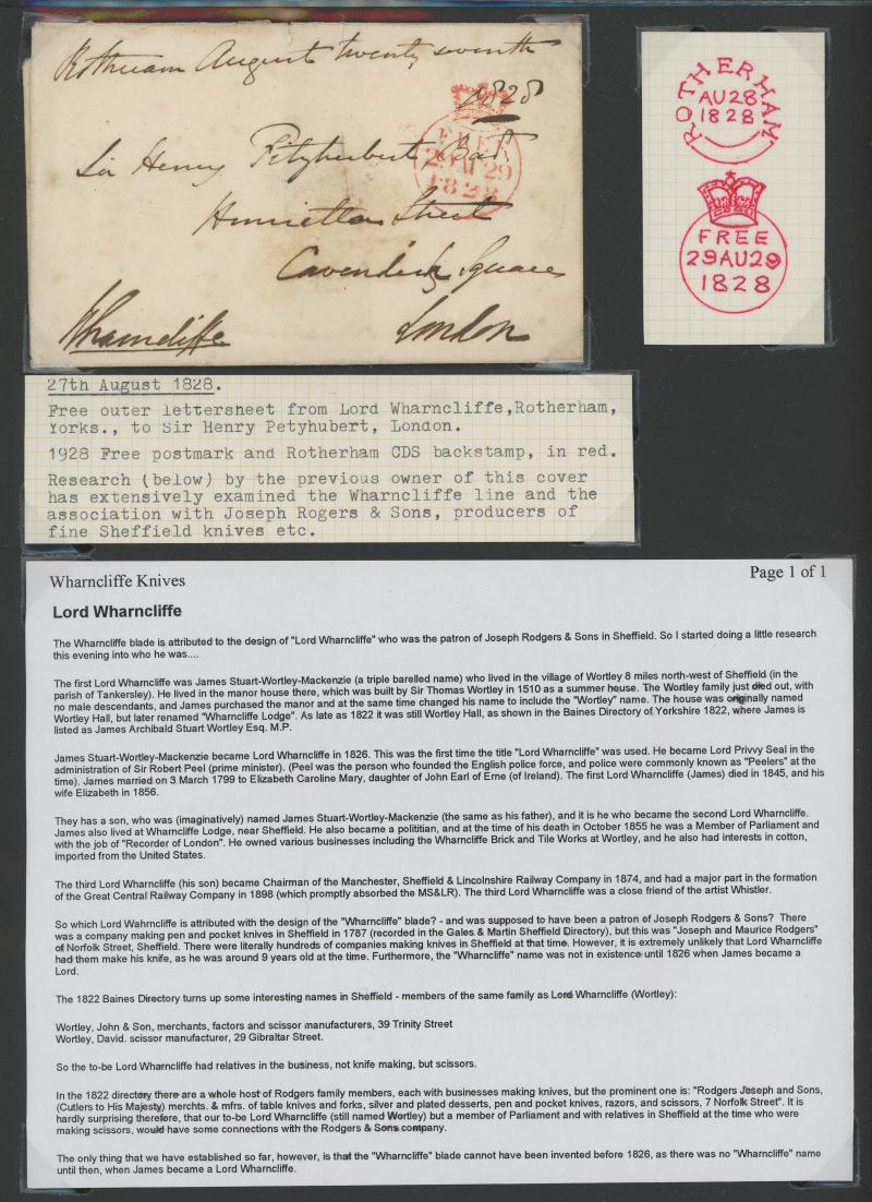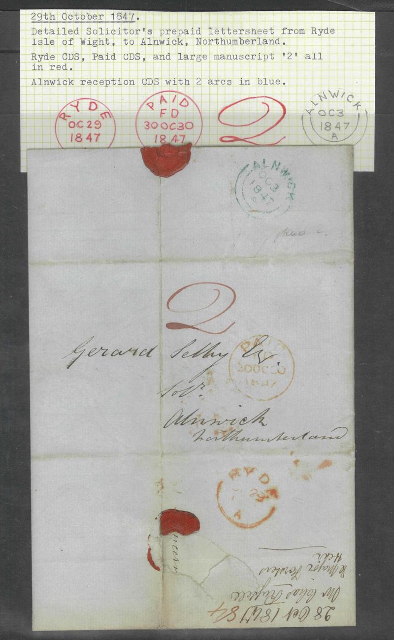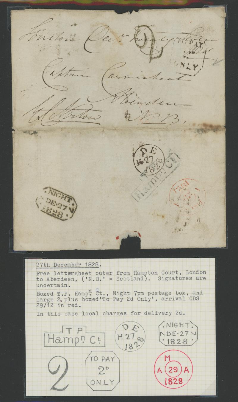 Park illustrated letter sheet endorsed "Pd 1" with superb 'TADCASTER' cds, 1839 with 'Rosamond S[t]/2D PAID' largely very fine strike (office not listed in 'Collect British Postmarks'), 1842 from Wales with superb 'BANGOR' in black & 'Pd 1d' h/s in