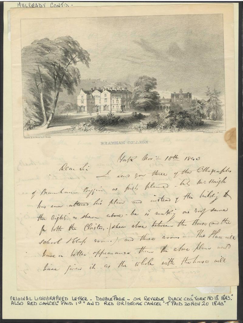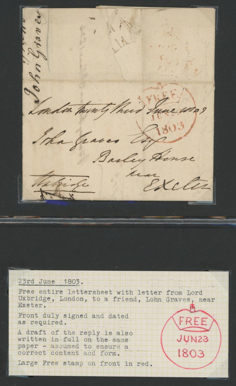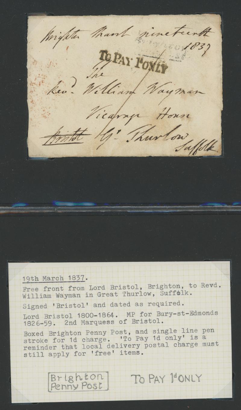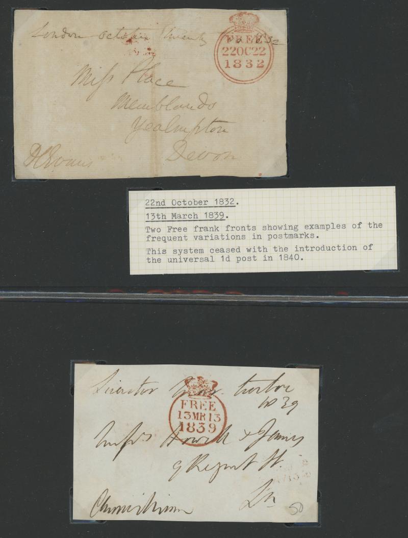 red, 1843 Bramham College illustrated letter sheet from York with 'PAID/1' h/s in red and 1847 with 'PAID/1D/CHELMSFORD' oval h/s in red, also unpaid items with "2"[d] to pay, and 1770s-1830s ten Free Frank items with autographs of Lords & Bishops,