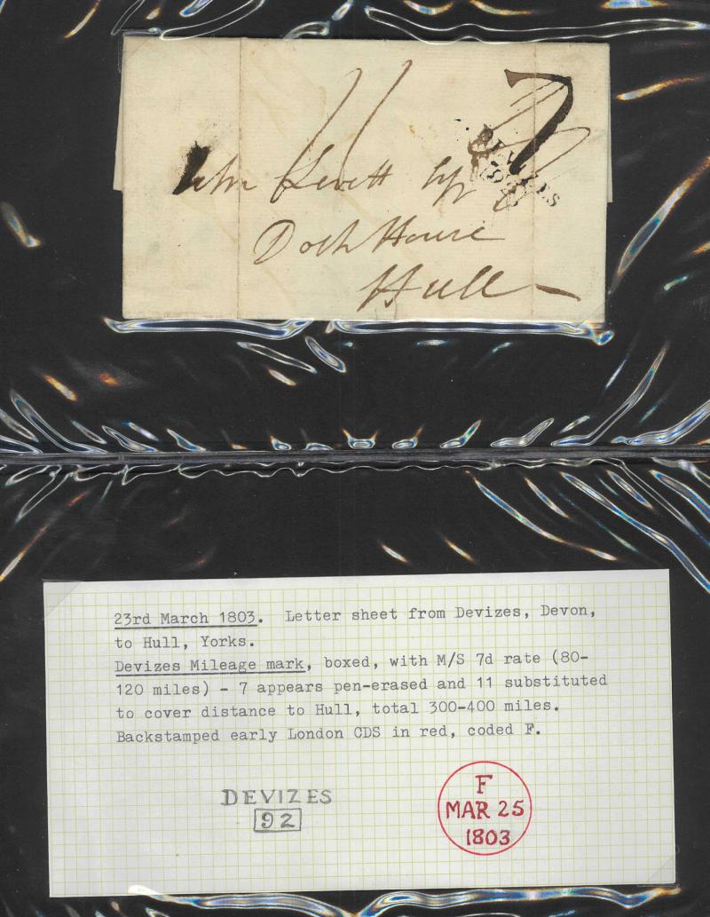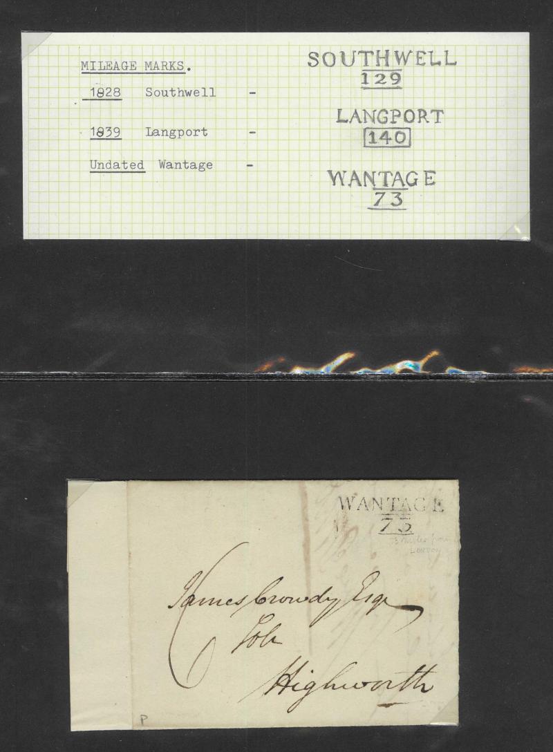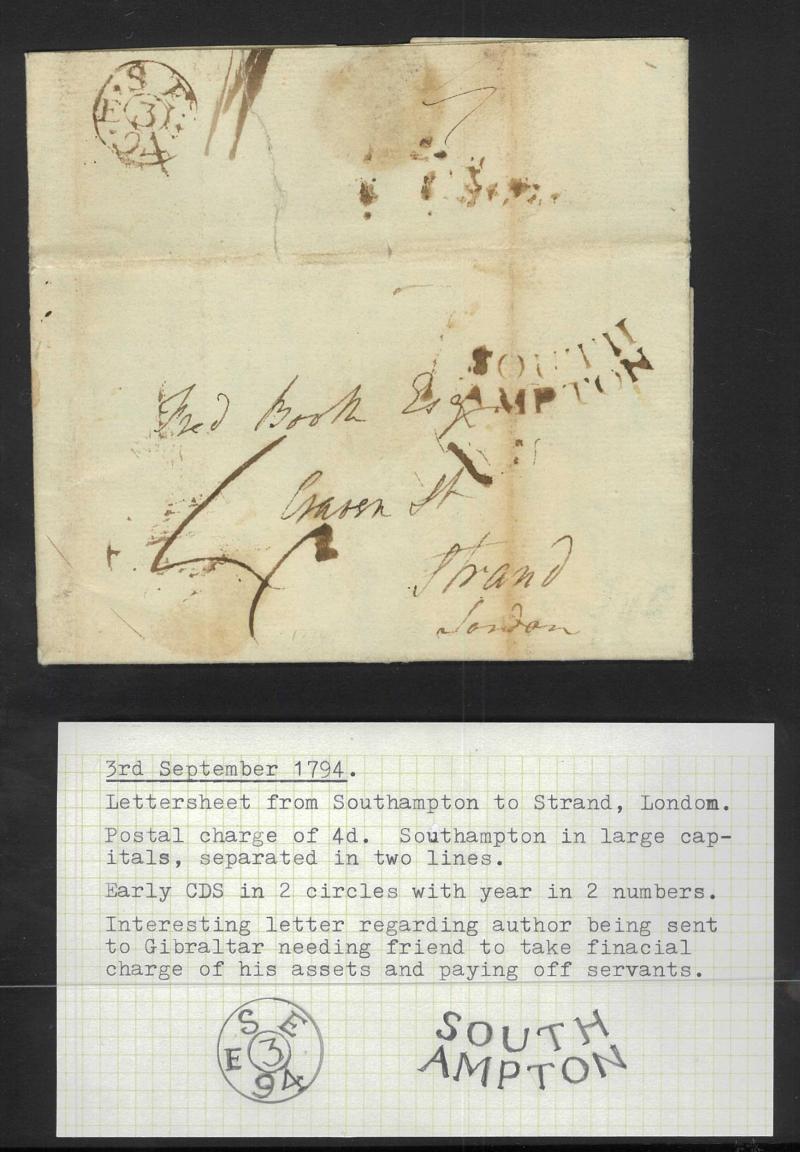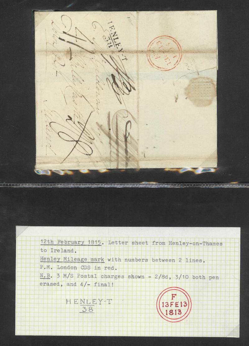 Curved 1794 'SOUTH/ AMPTON', Boxed Mileage Marks 1802 'LITCHFIELD/119' & 1803 fine 'DEVIZES/92', Framed Mileage Marks 1815 'HENLEY-T/38' to Bally Castle Ireland rated "2/8"[d] & "3/10"[d] both crossed out and replaced with "4/-" and 'WANTAGE/73',