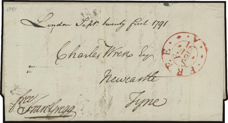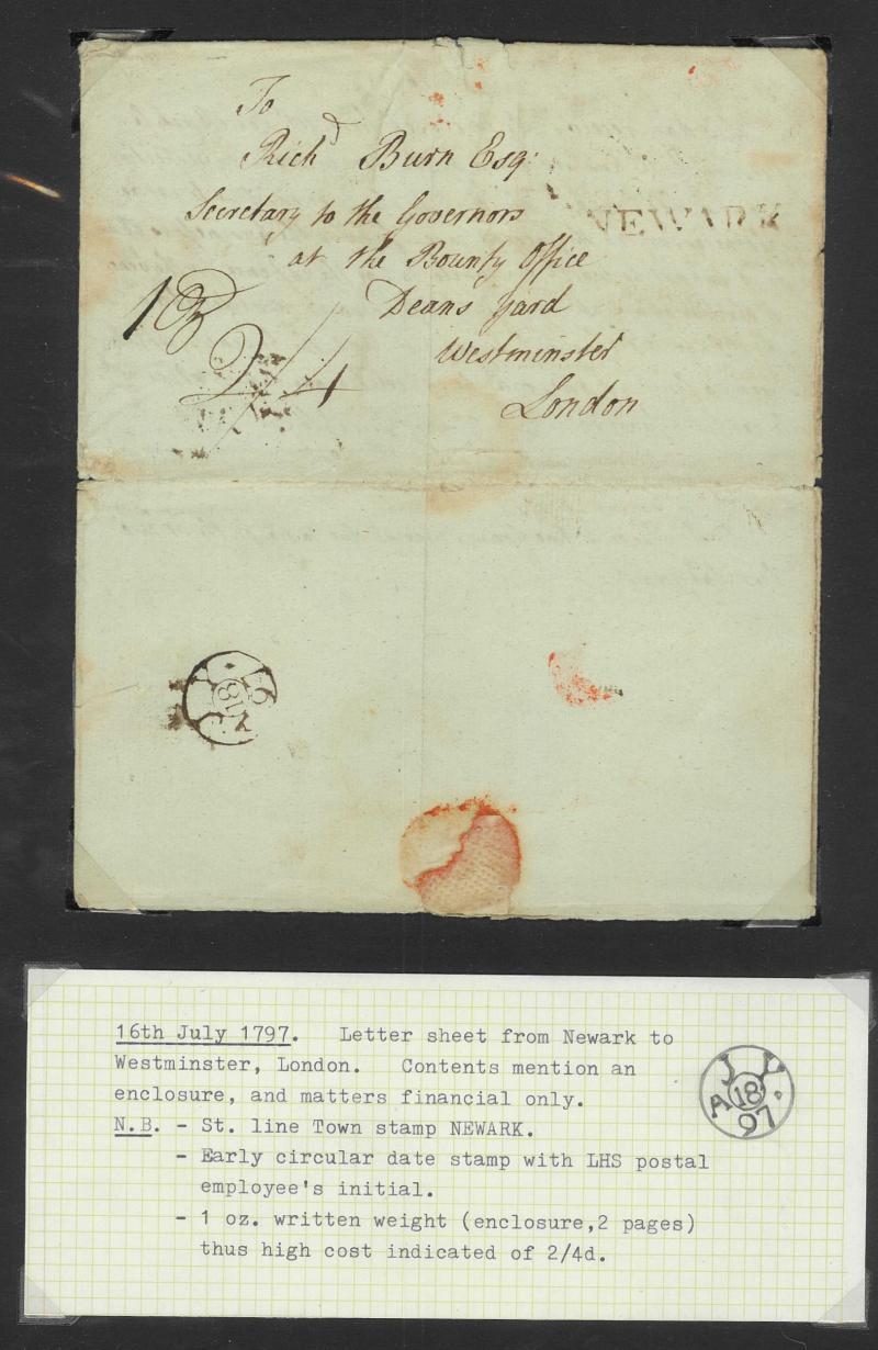 Dockwra handstamp, 1775 with London General Office 'PENNY/POST/PAID/G/SA' Dockwra & very fine Temple Office 'o'CLOCK/5/T' backstamp, Single-Line Handstamps including 1792 'BRANDON', 1797 'BIRMINGHAM' & 1797 'NEWARK' (rated "2/4"[d]), Double-Line