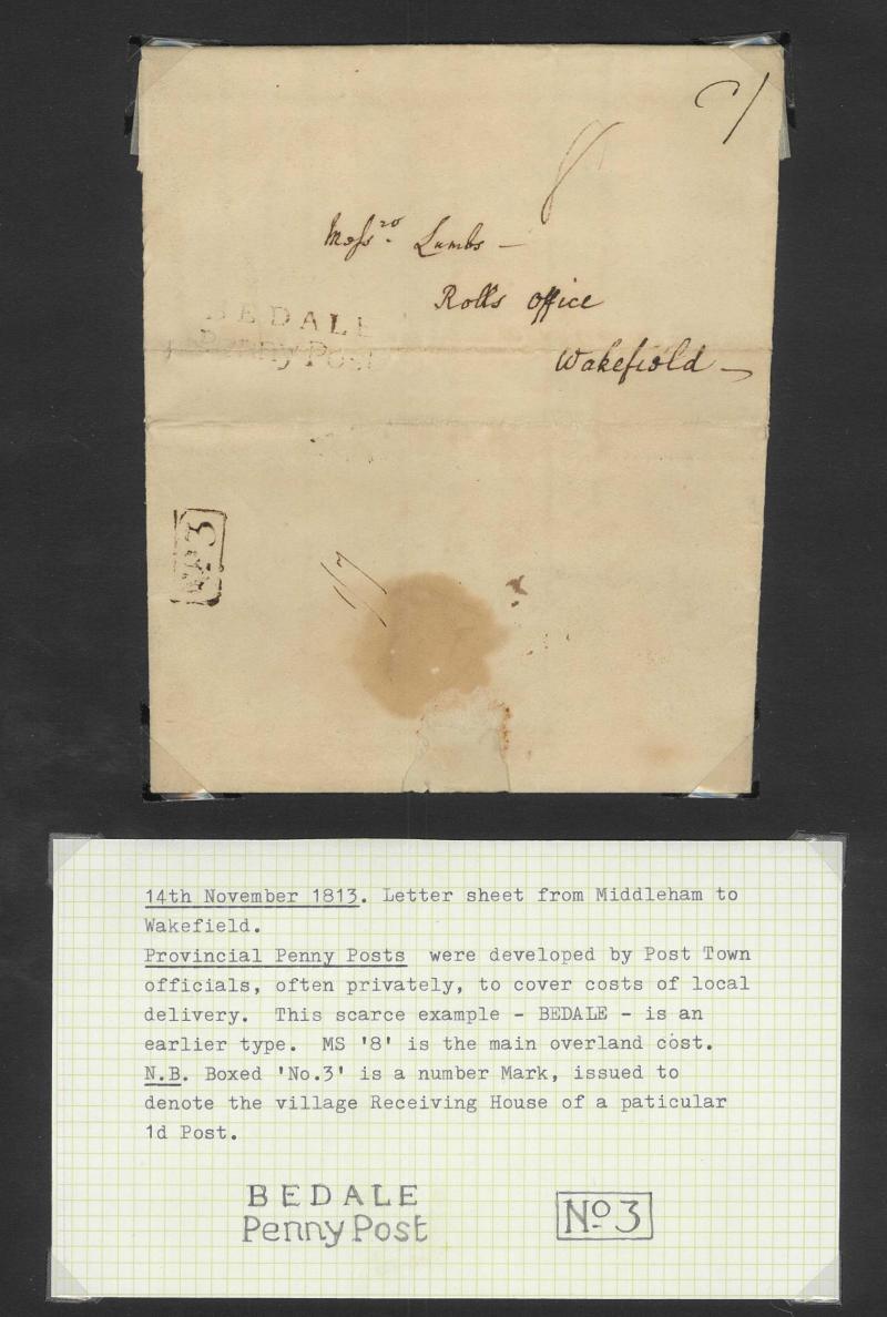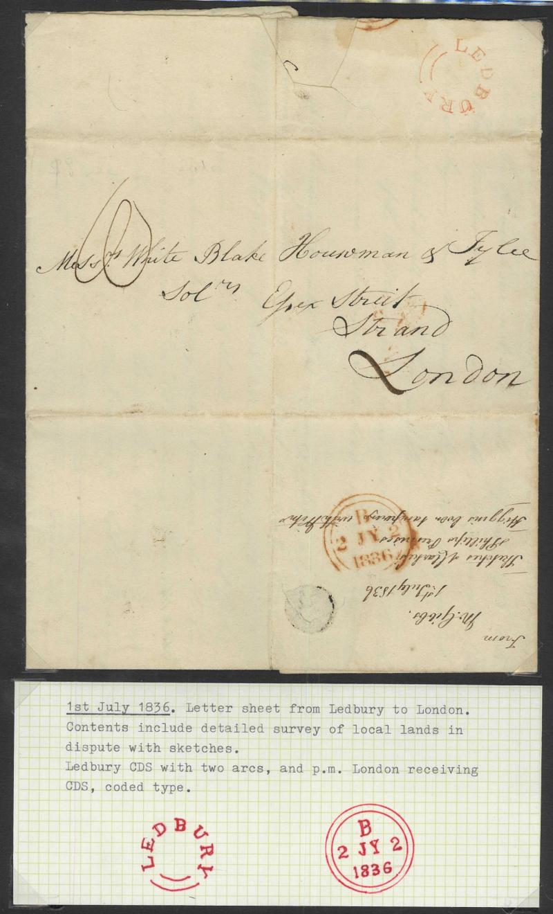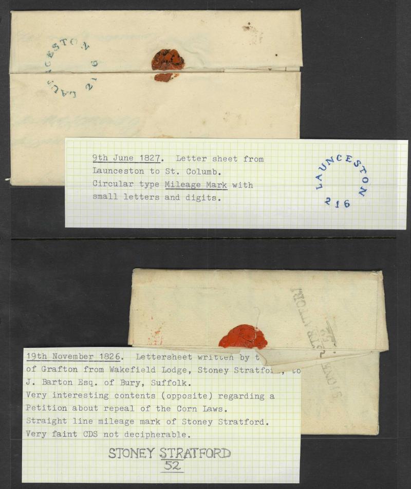 Undated Circular 1827 'LAUNCESTON/216' in blue, also 1813 largely fine 'BEDALE/Penny Post' and 1819 light 'FAREHAM/Penny Post' both with boxed 'No3' Receiving House handstamp, 1836 'LEDBURY' undated circular cancel in red, two 1837 items with Crown