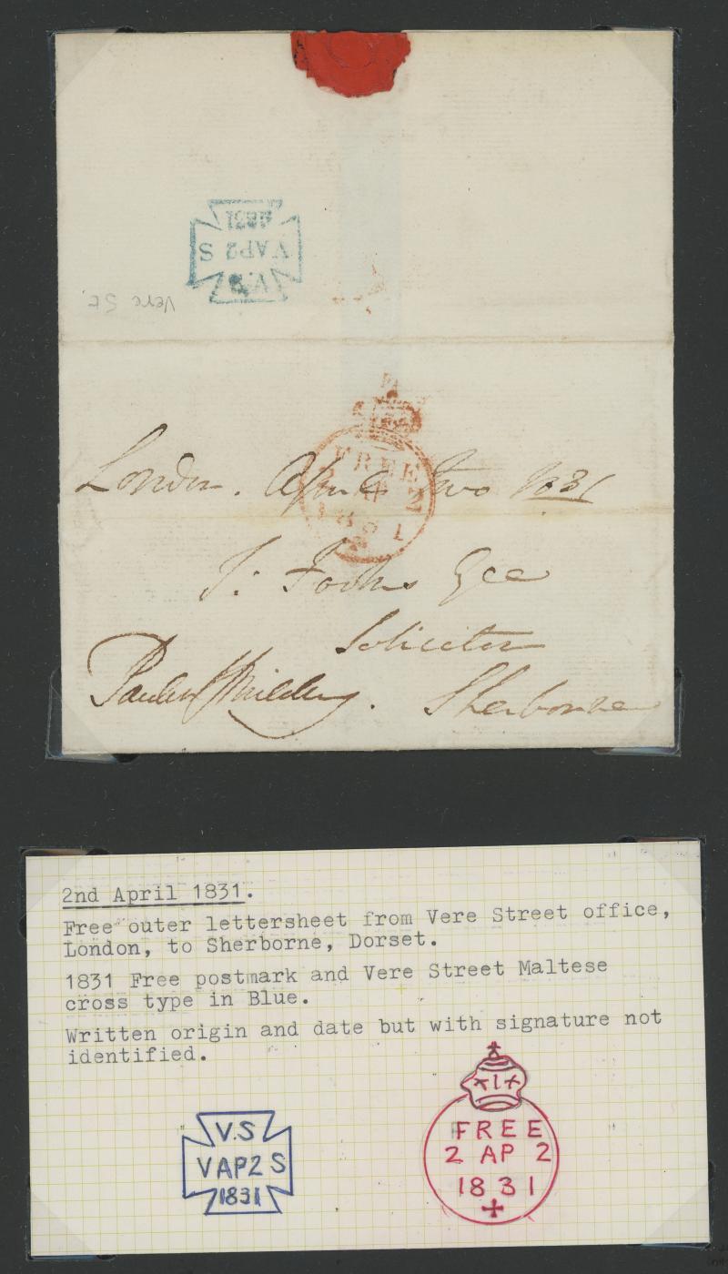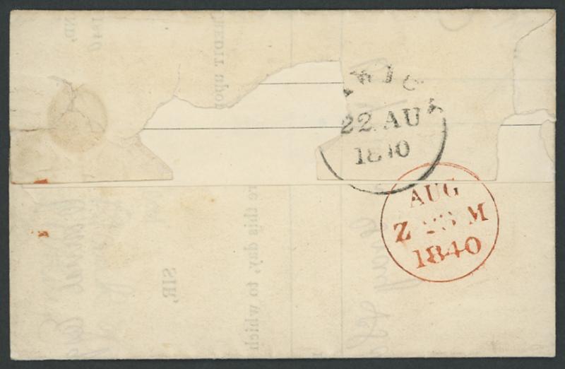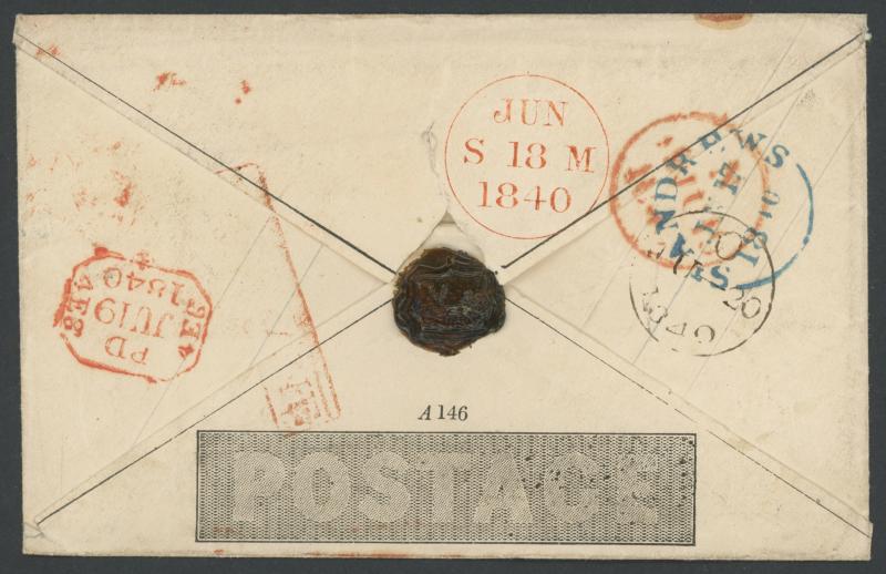 ANDREWS' cds in blue & very fine 'JUN/S 18 M/1840' cds in red of London where redirected to Wiltshire with Penny Black Plate 1a (3½ margins, ink stain at lower-right) tied to the face by complete Maltese Cross in red with another superb strike
