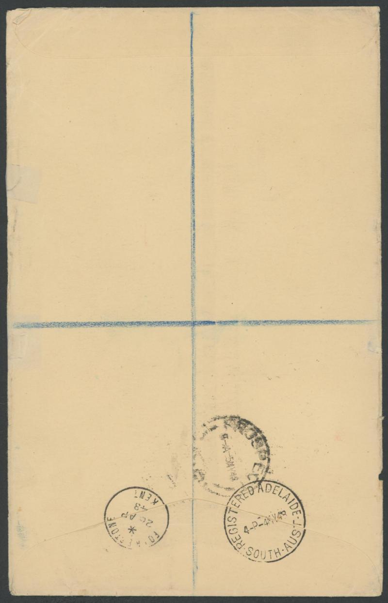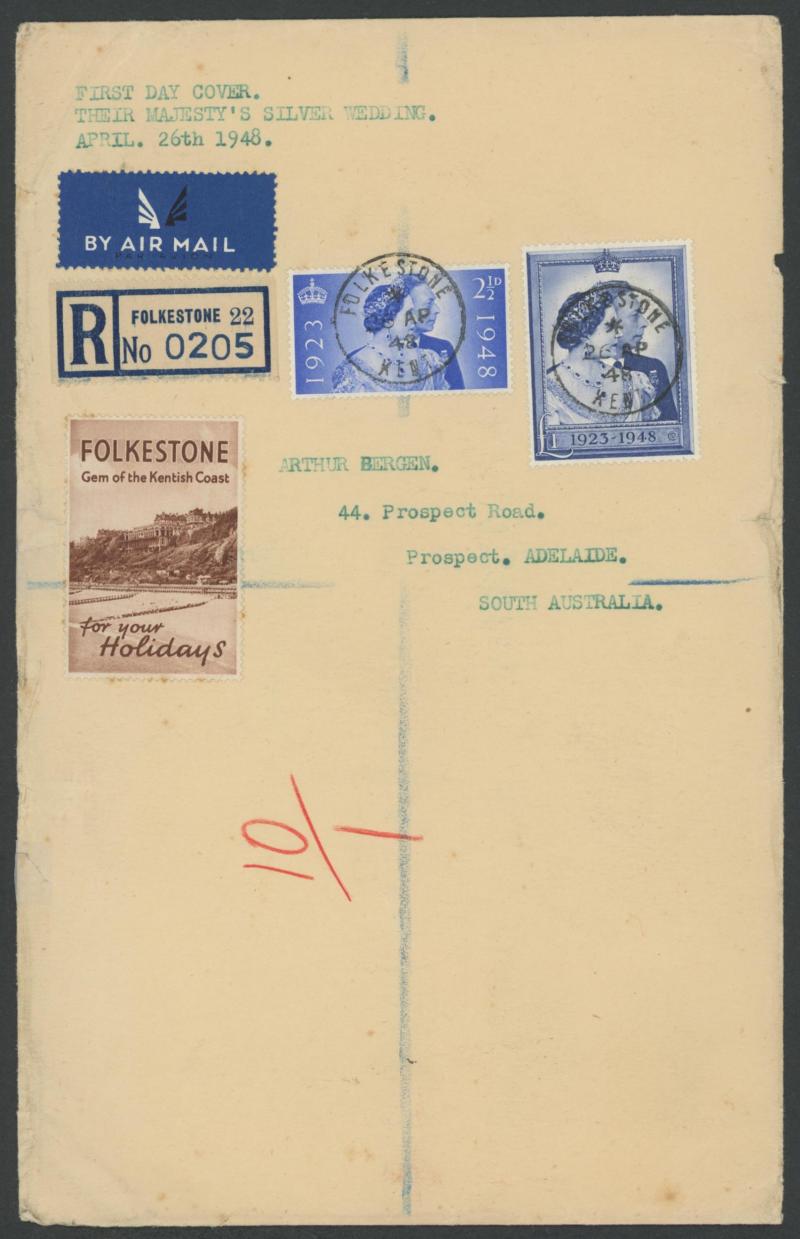 cds being the First Day of Issue, blue/white R label & brown Folkestone tourism label, Adelaide arrival backstamp of '4MY48', minor repaired edge tears. (Image1) (Image2)