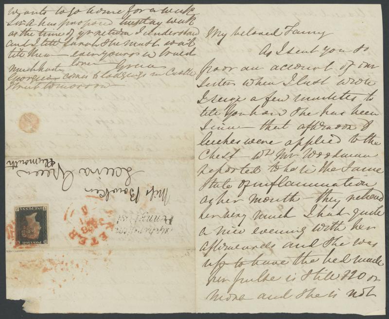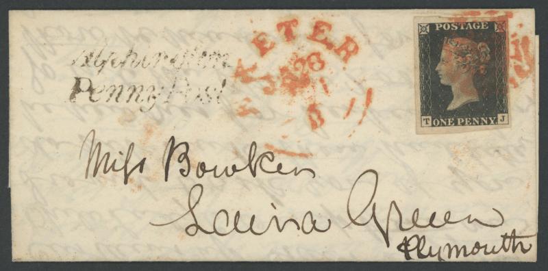 1841 (Jan 28) entire to Plymouth, Devon with 1d black (4 margins) tied by Maltese cancel in red, discontinued 'Alphington/Penny