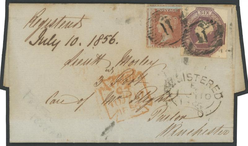 1856 registered entire to Hampshire with 1d red and Embossed 6d dull lilac embossed (cut-square; Cat £1900 on cover) tied by barred