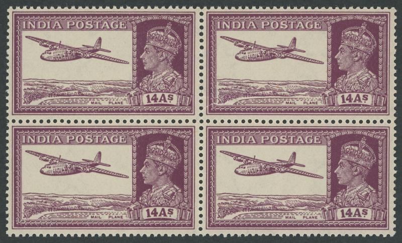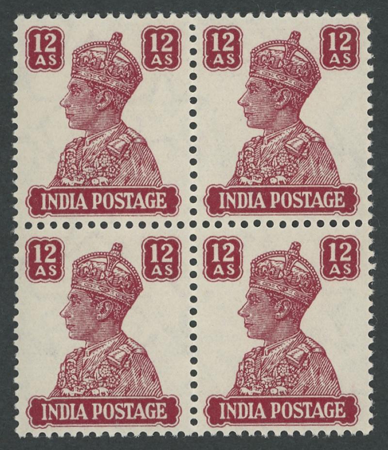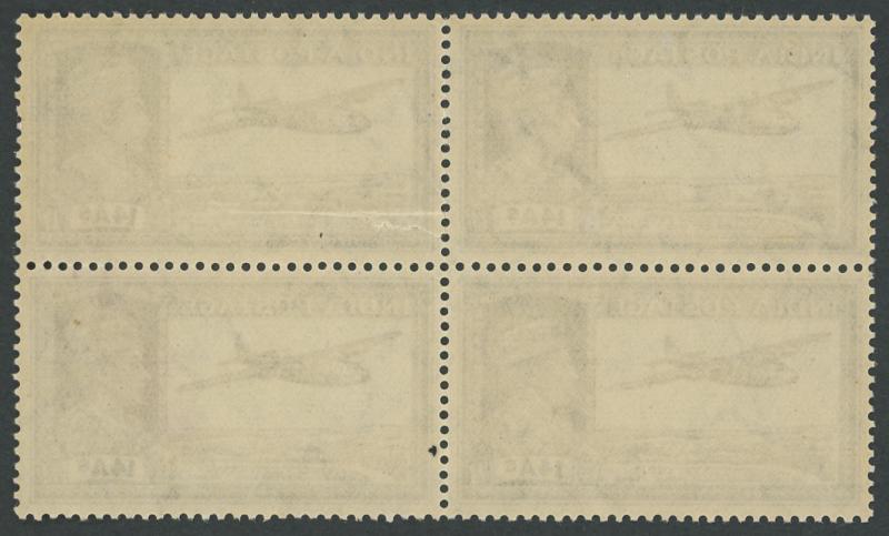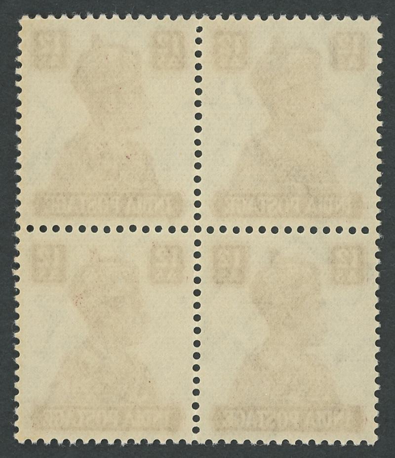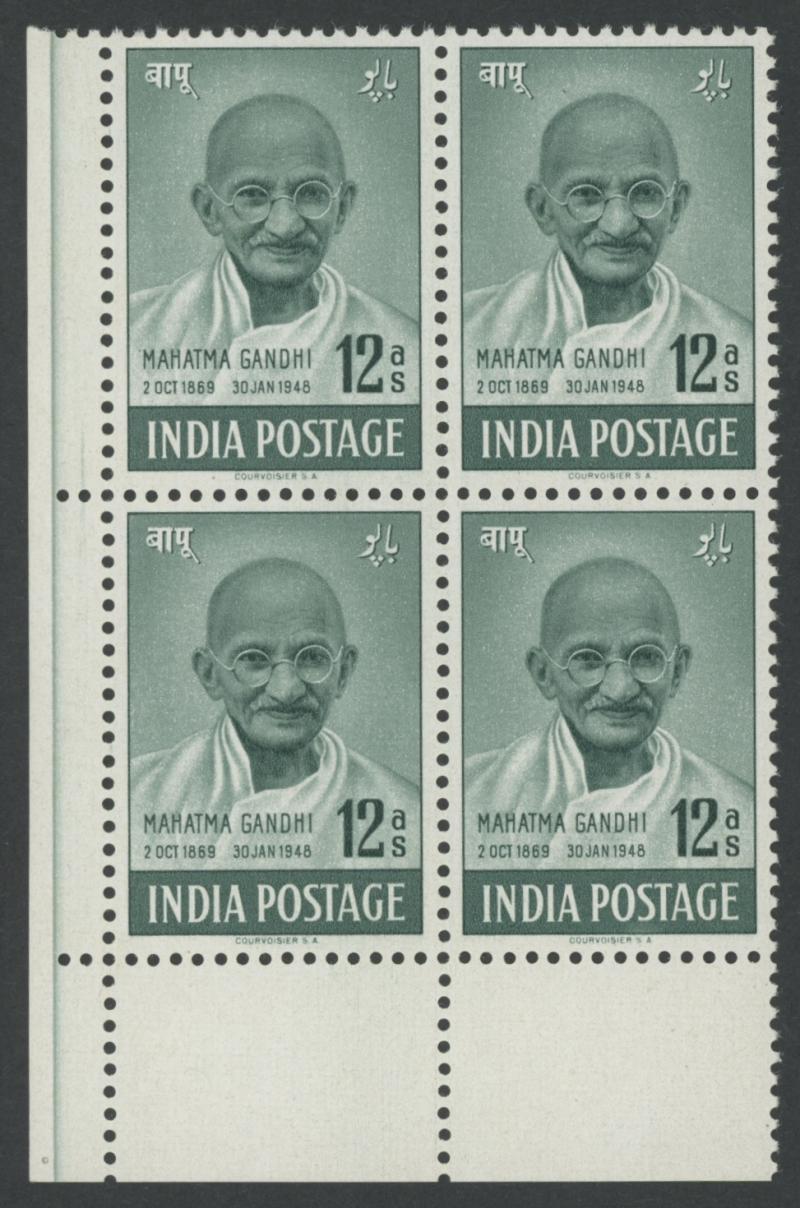 1948 Independence Mahatma Gandhi 12a grey-green & 10r purple-brown & lake SG 307-88 blocks of 4 from the lower-left corner of the