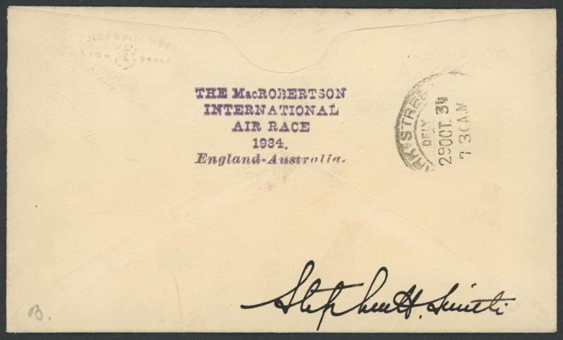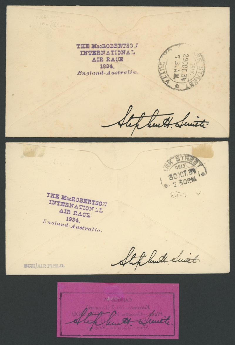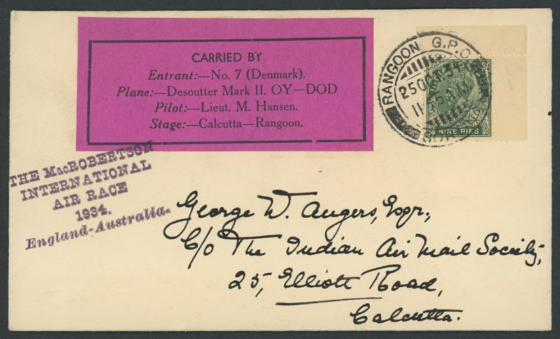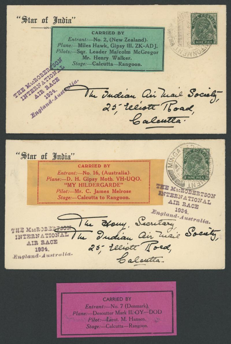 POSTAL HISTORY: 1934 MacRobertson Air Race Stephen Smith Calcutta-Rangoon intermediates per Jimmy Melrose, McGregor & Walker or