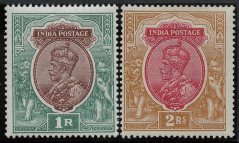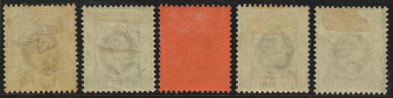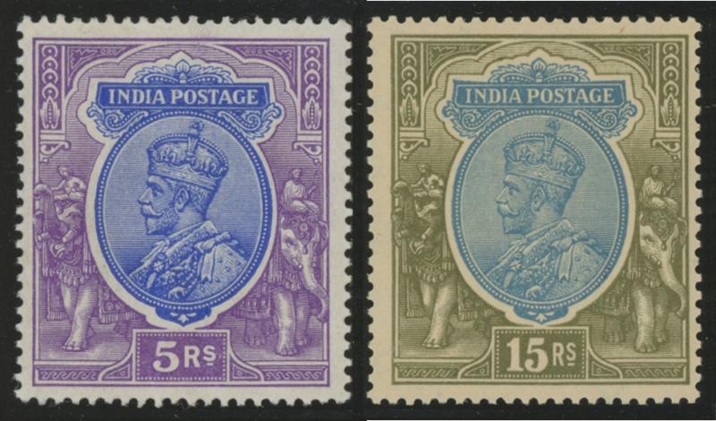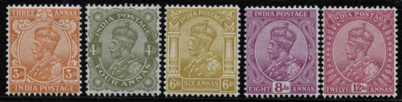 1911-23 KGV Definitives 3p to 5r simplified set with one of each denomination (both 2a6p types) plus 15r blue & olive between SG