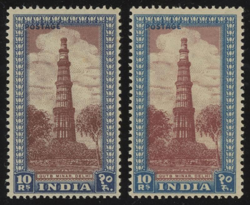 1949-52 Pictorials Qutb Minar Delhi 10r purple-brown & deep blue SG 323 and 10r purple-brown & blue SG 323b, both fresh &