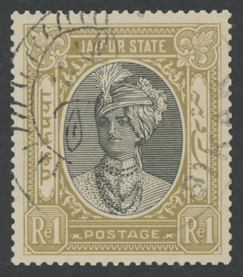 JAIPUR: 1943-46 Maharaja Sawai Man Singh II inscribed 'POSTAGE' 1r black & yellow-bistre SG 67, well-centred, large-part cds
