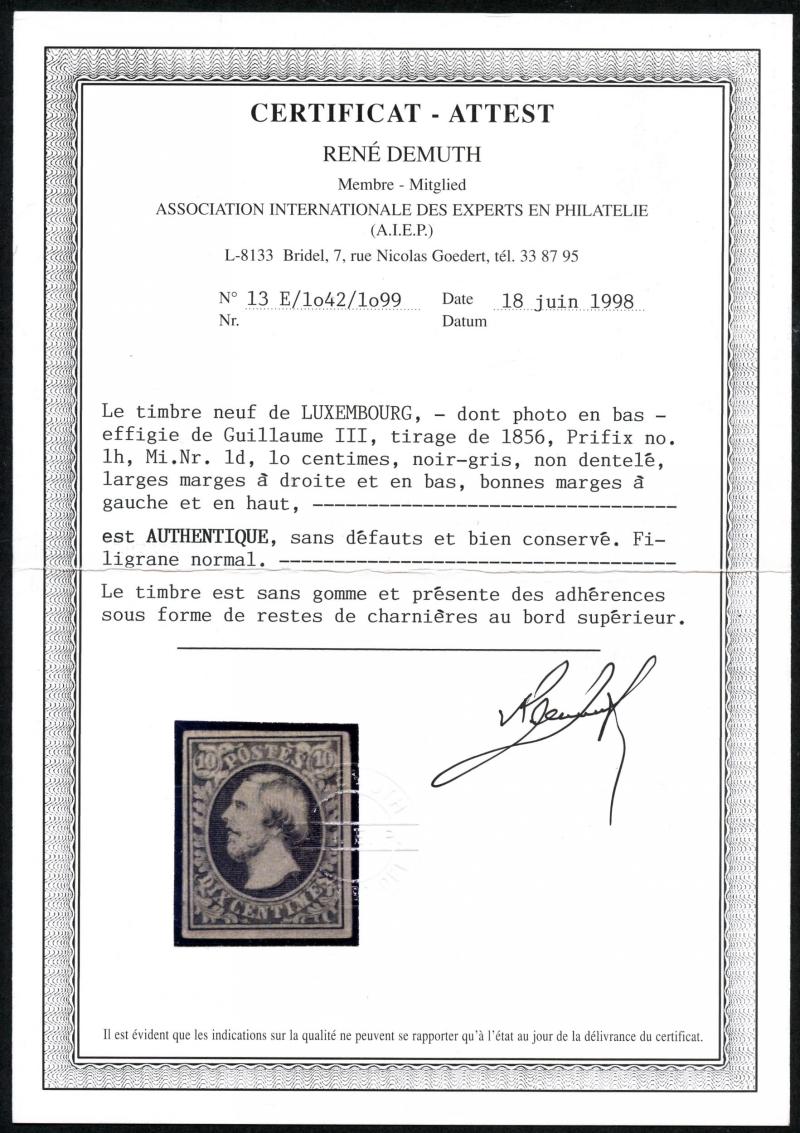 1852 Wilhelm III 10c grey-black Mi 1d (SG 2), good even margins, unused, Cat €2800 (£3500). Renè Demuth Certificate (1998). A