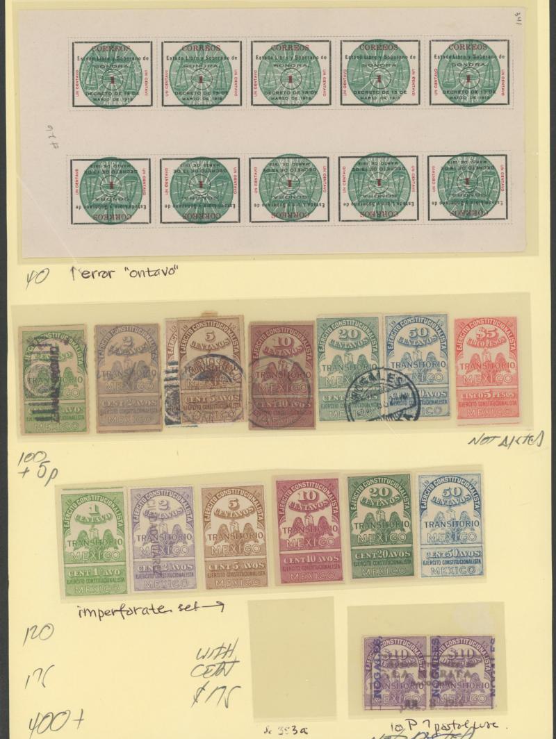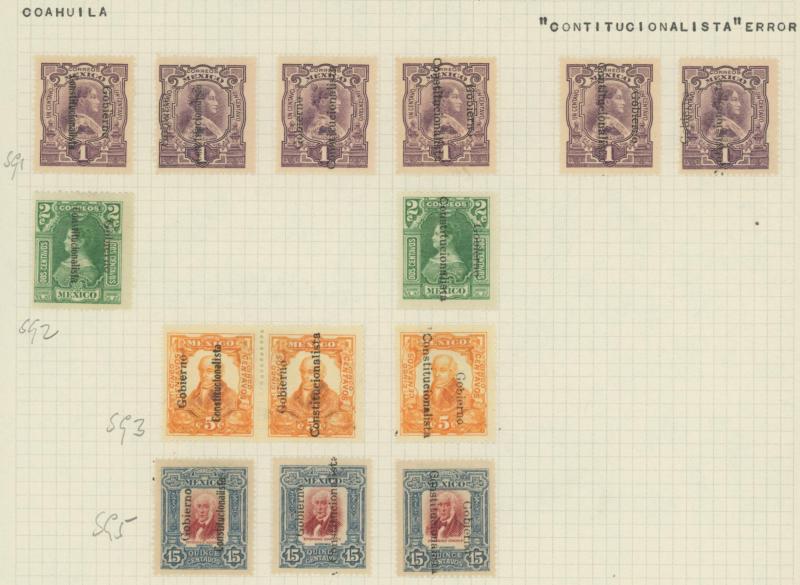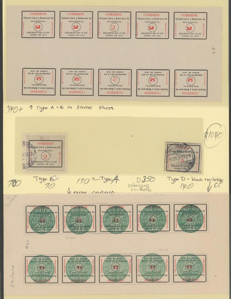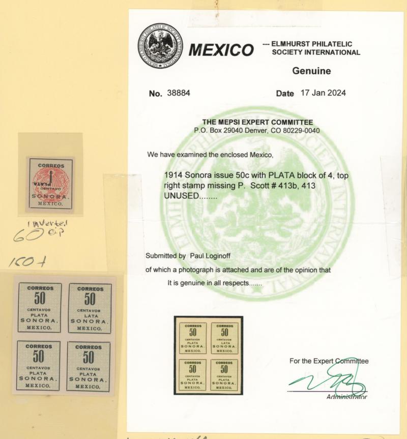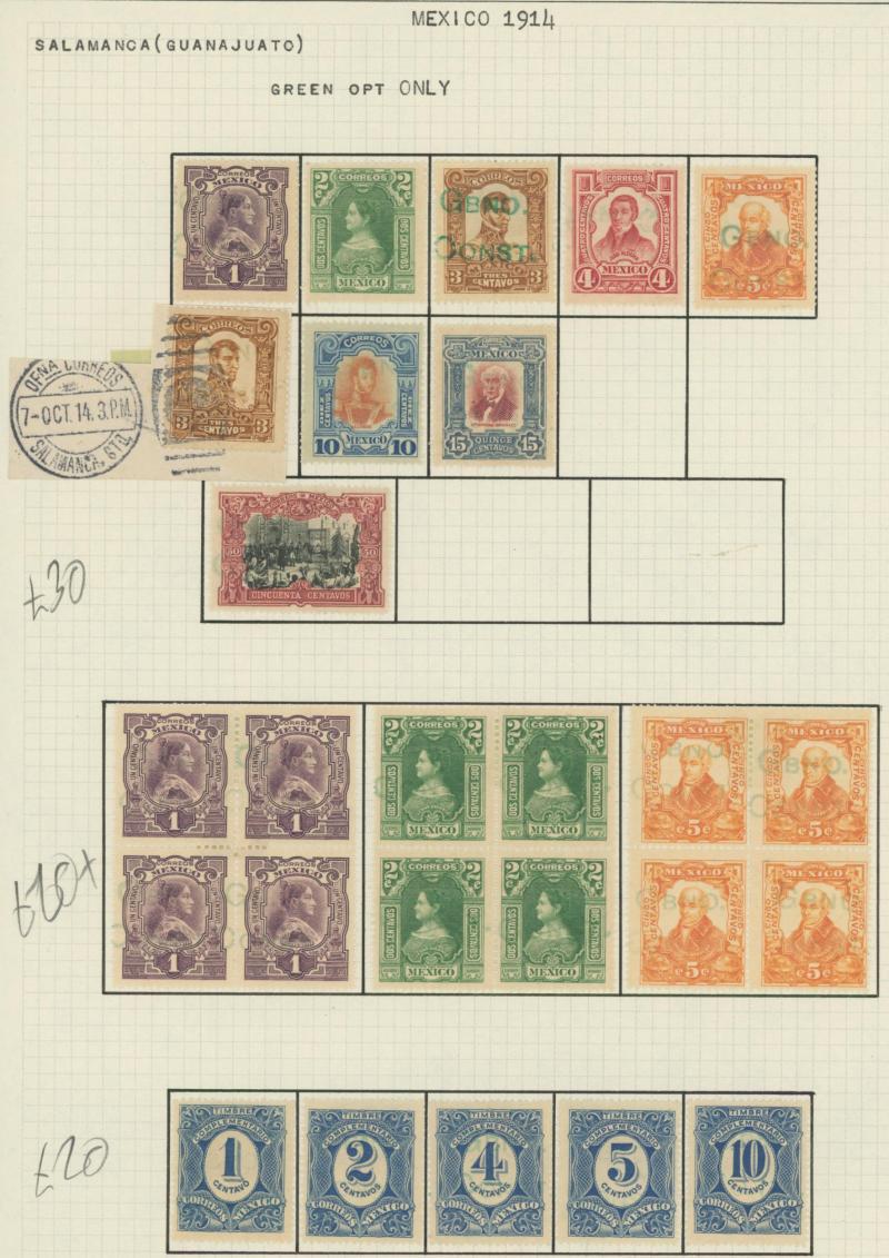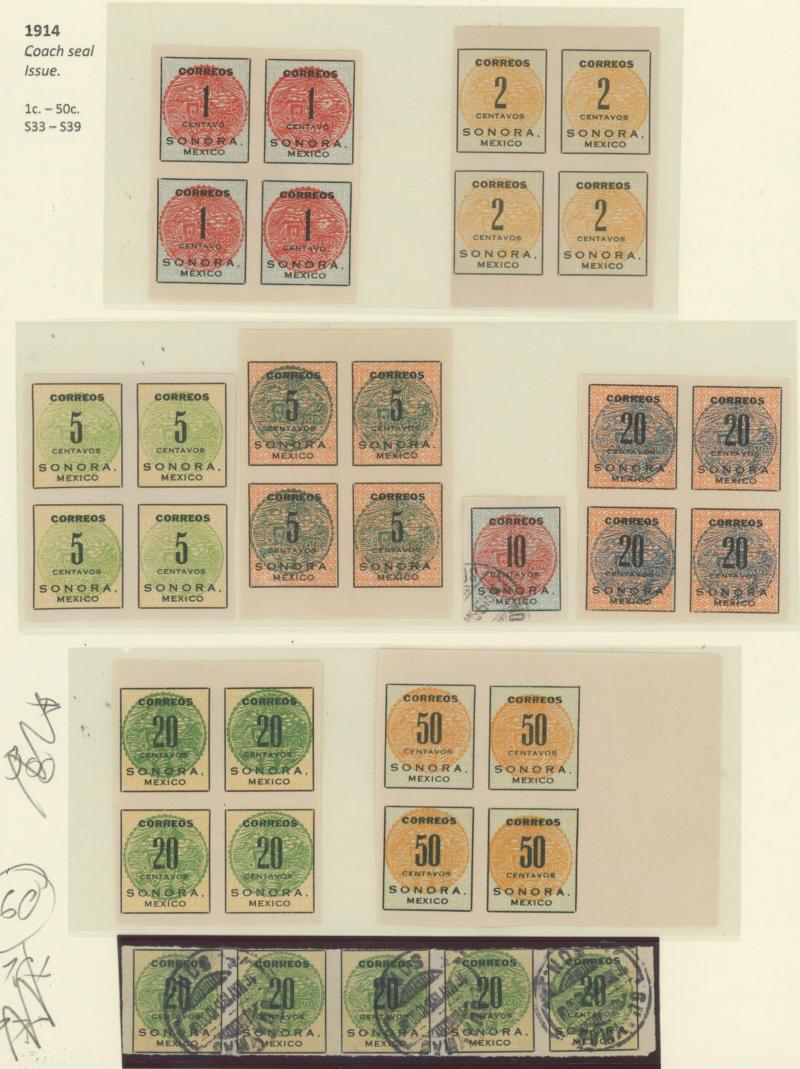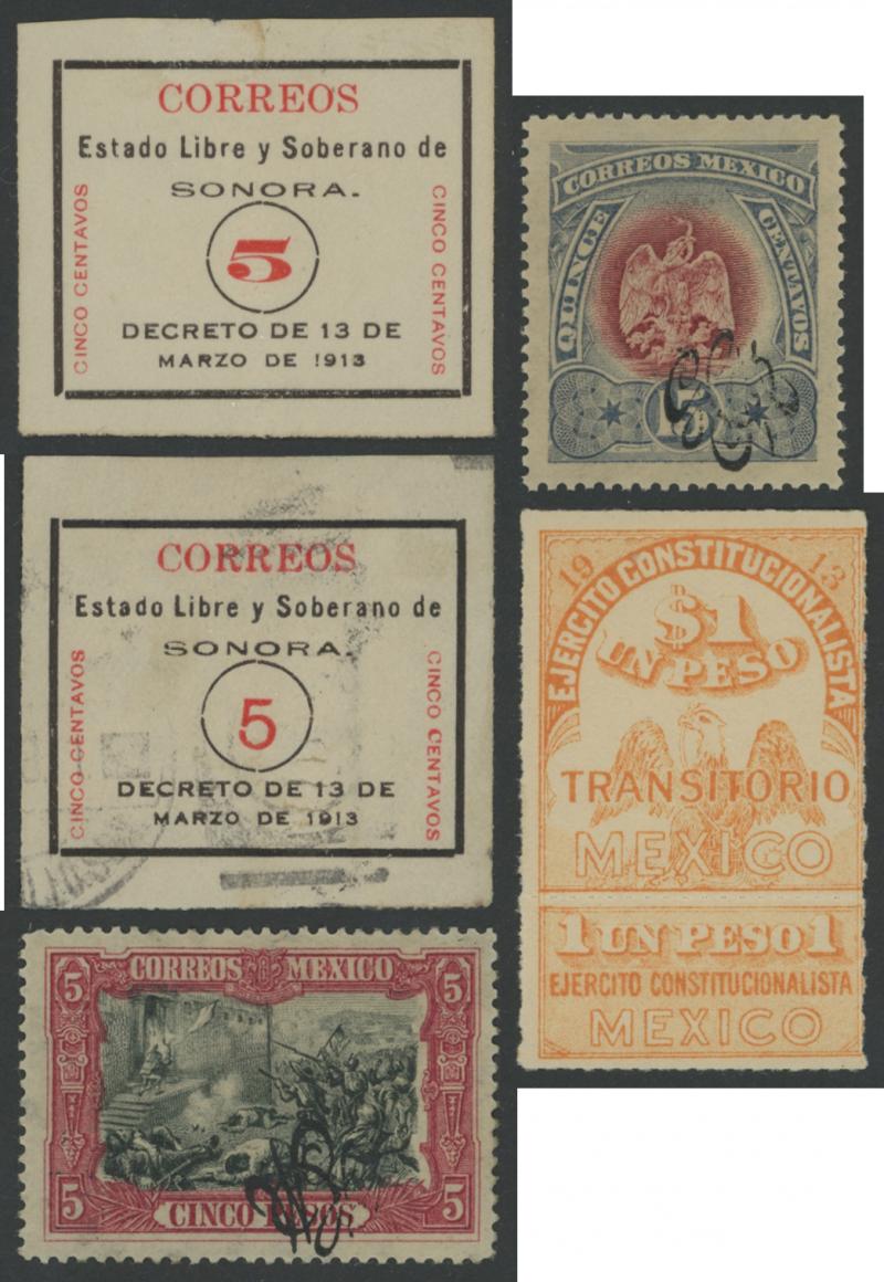 MEPSI Certificate) including 5c used block of 10 (5x2) plus unlisted 5p (**), 'PLATA/SONORA' 50c block of 4 one unit with ' LATA' Error (with MEPSI Certificate), 1914 'GSM' Handstamps to 1p plus Postage Dues set, Carranza Small Monogram set to 5p