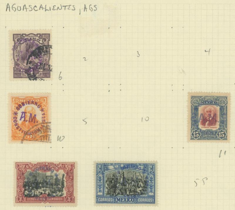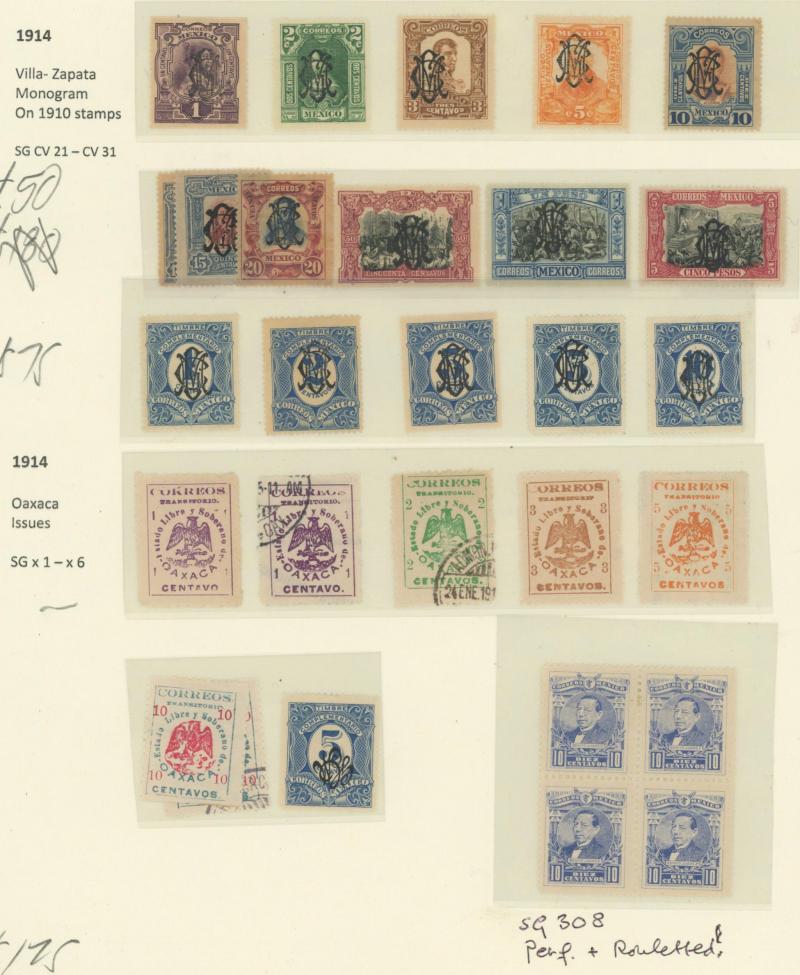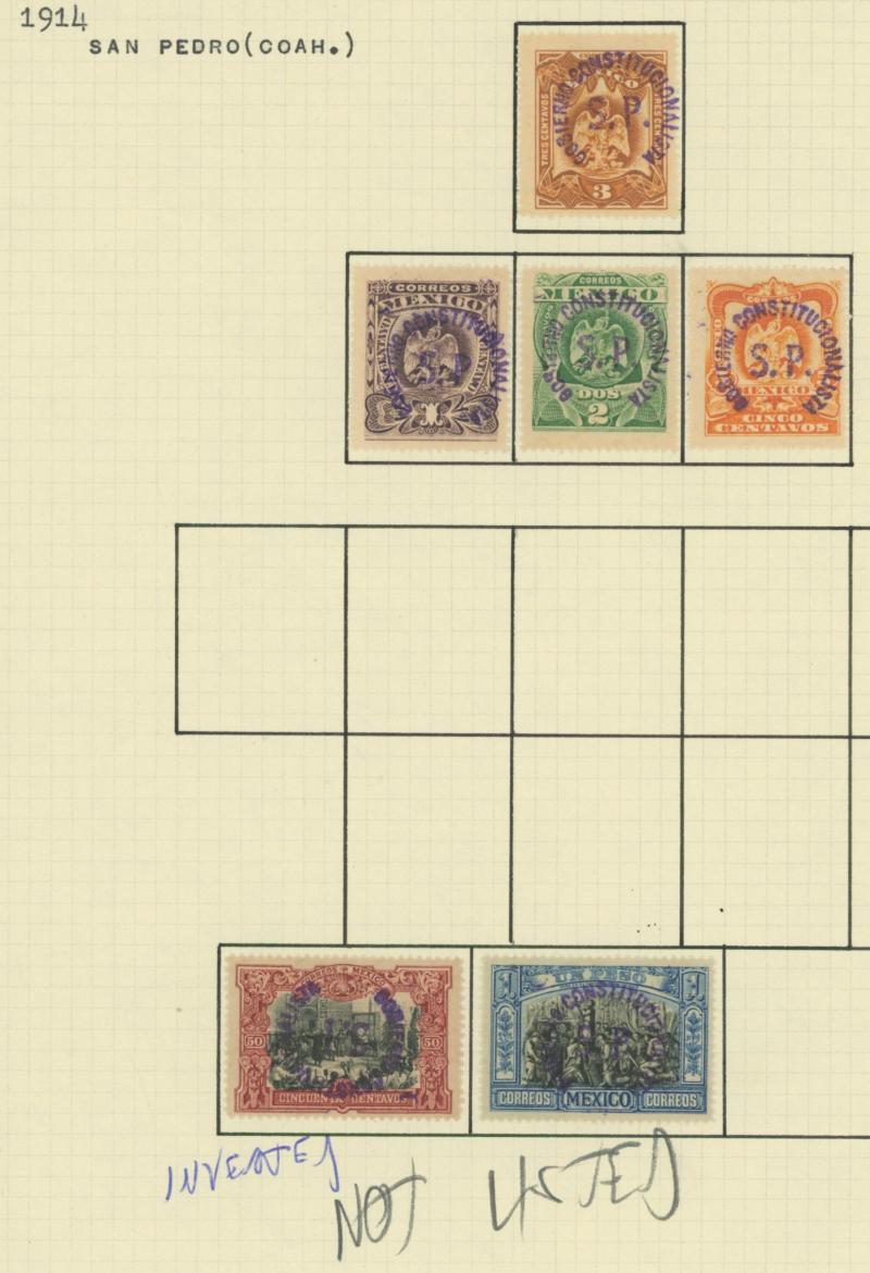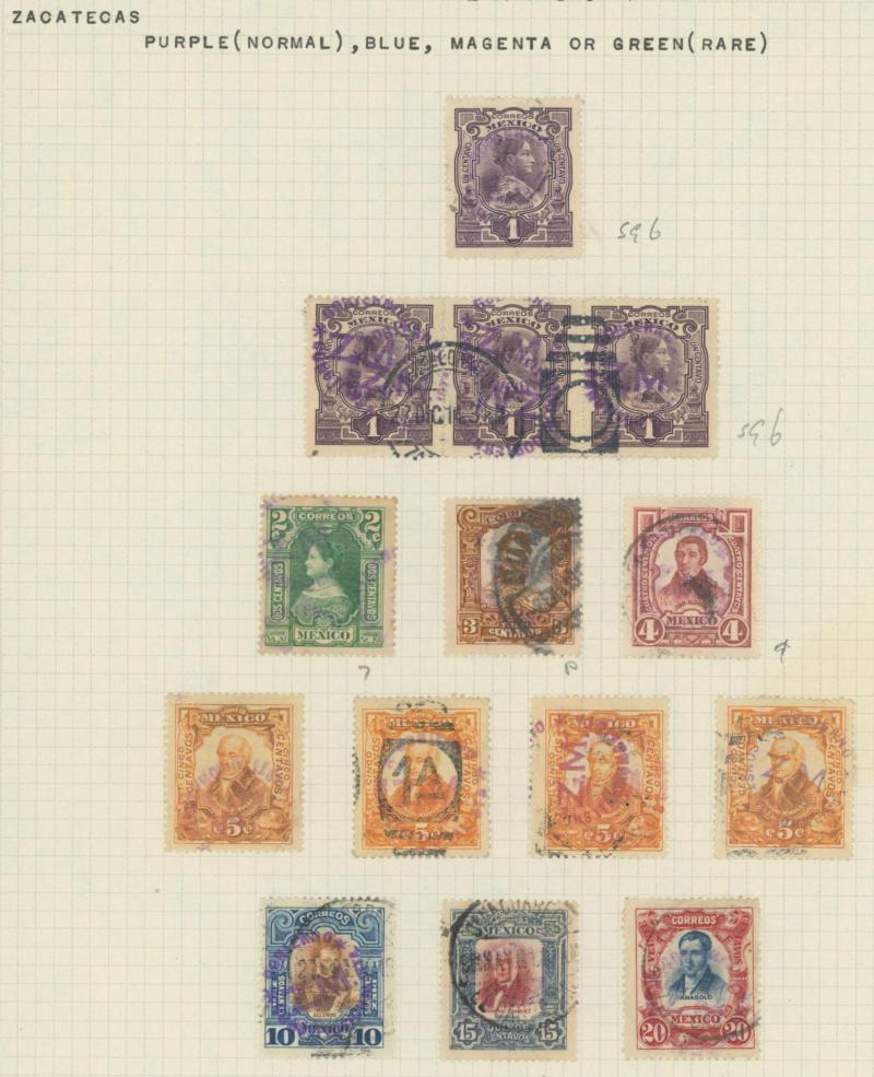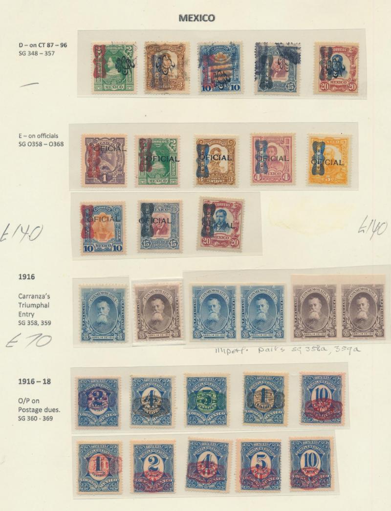 Potosi 5c (used) & Postage Due 10c both with the Handstamp Inverted; San Pedro 'S.P.' Handstamps 1c to 3c & 5c all unpriced plus 50c with the Handstamp Inverted & 1p unlisted values; Toreon straight-line to 1p & 'T.C.' to 1p; Zacatacas 1c used strip