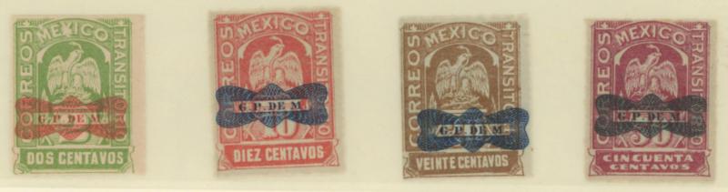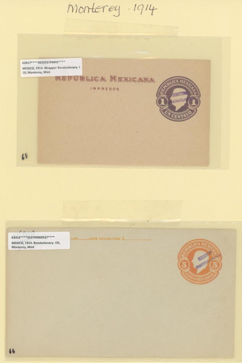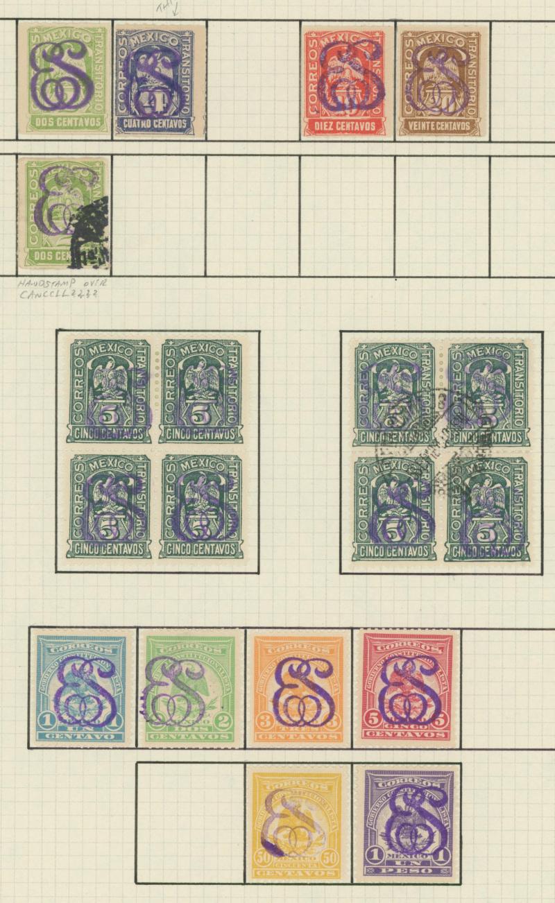 of 4 & 50c strip of 3 + 1c & 2c blocks of 4 with the Handstamp Diagonally and 1p with Handstamp Inverted (used; unpriced thus); Colima 5c & 15c with the Handstamp Inverted; Monterey Pictorials to 50c x2 & 5p and 1c Wrapper & 5c Envelope; San Luis