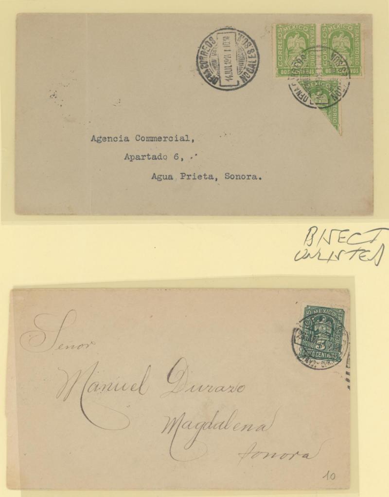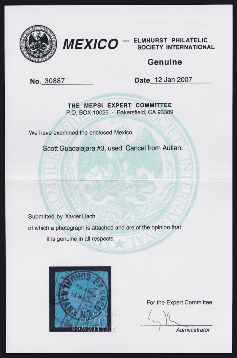 close to large, two large-part very fine strikes of 'FRANCO/AUTLAN' undated oval cancel, Cat £170 (US$450). Scarce usage outside of Guadalajara City. MEPSI Certificate (2007). (Image1) (Image2)