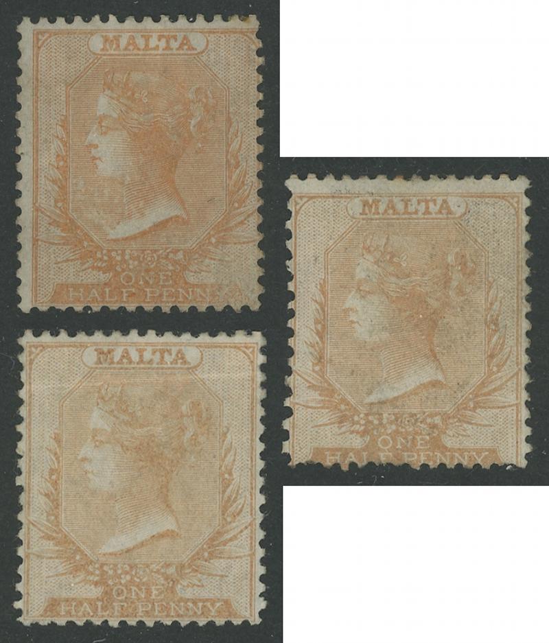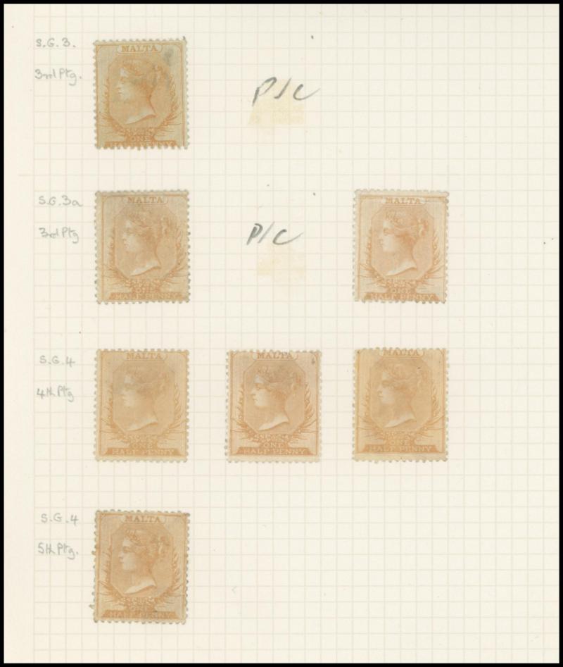 1863-84 Halfpenny annotated selection with unused printings identified as SG 2 (small thin), 3 x2 (one with blemishes), 3a x3, 4