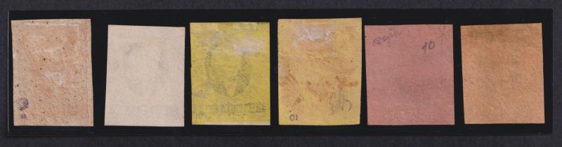 red-lilac unused, then 4r black/yellow unused & used, 4r rose/yellow unused & used, 8r black/rose used & 8r green/rose unused (no handstamp), margins mostly good to touching, condition generally fine to very fine, none have been expertised, so