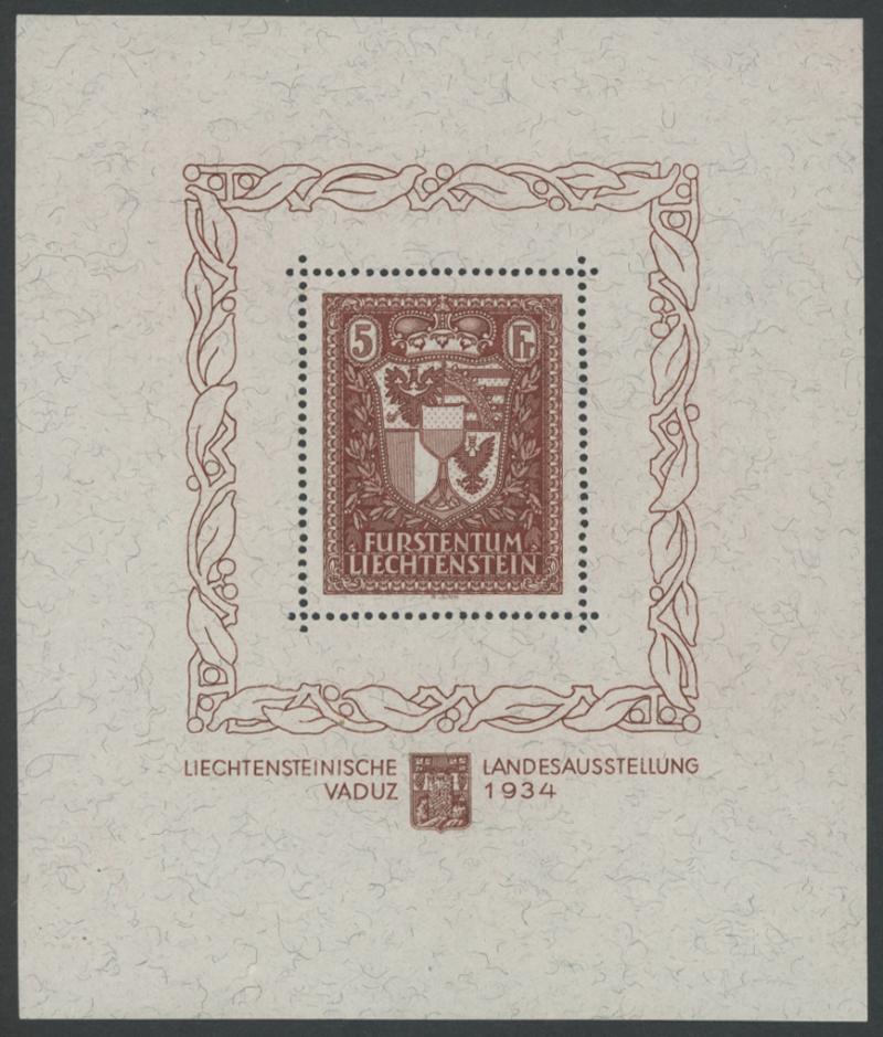 1934 Vaduz Philatelic Exhibition Arms 5fr brown M/S (125x106mm) SG MS144 (Michel Block 1), exceptional centring, very lightly