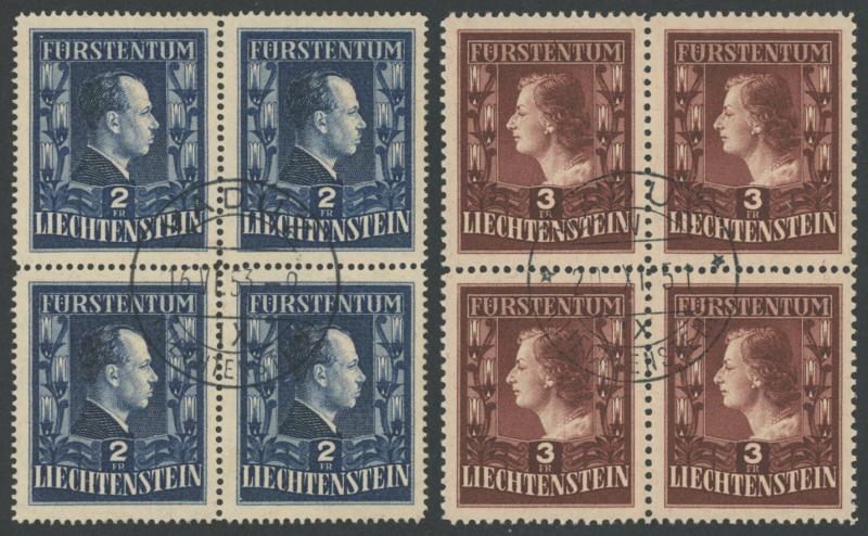 1951 Prince Franz Joseph II & Princess Georgina Perf 12½ 2f blue & 3f lake-brown SG 302A & 303A (Michel 304A & 305A) blocks of 4
