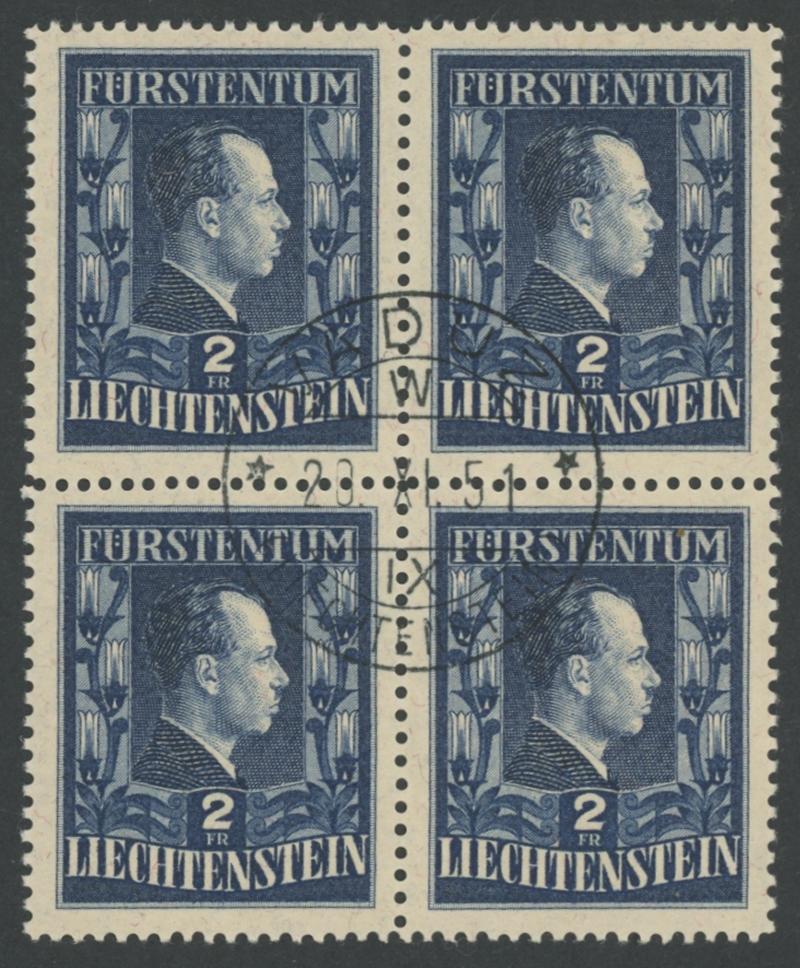 CTO with Vaduz '20.XI.51' cds cancels being the First Day of Issue, well-centred, the upper units with small hinge remainders, the lower units full unmounted gum, plus Perf 14¾ 2f blue SG 302B (Michel 304B) block of 4 CTO with Vaduz '16.VI.53' cds