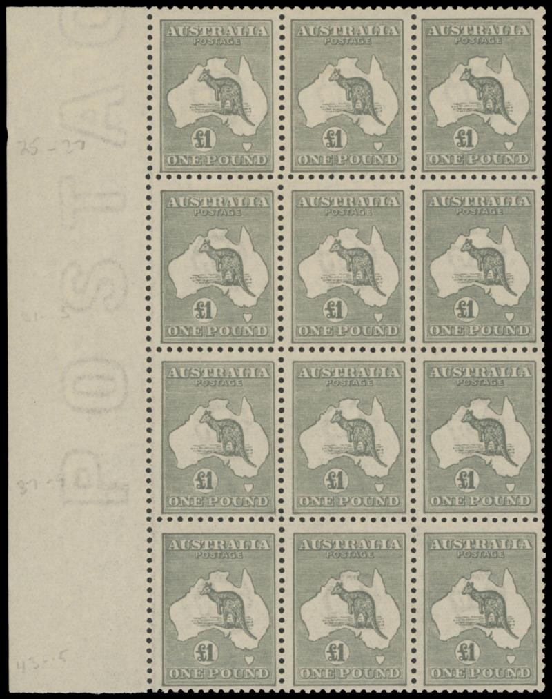 £1 grey ACSC 53A (SG 75) marginal block of 12 from the left of the sheet [L25-27/43-45], of very fresh appearance but the gum is