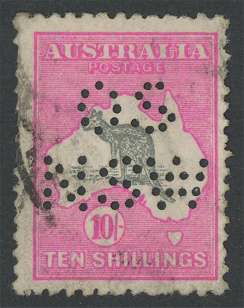 10/- grey & deep aniline pink ACSC 48B (SG 43a), characteristic wayward centring, a couple of slightly uneven perfs, commercially