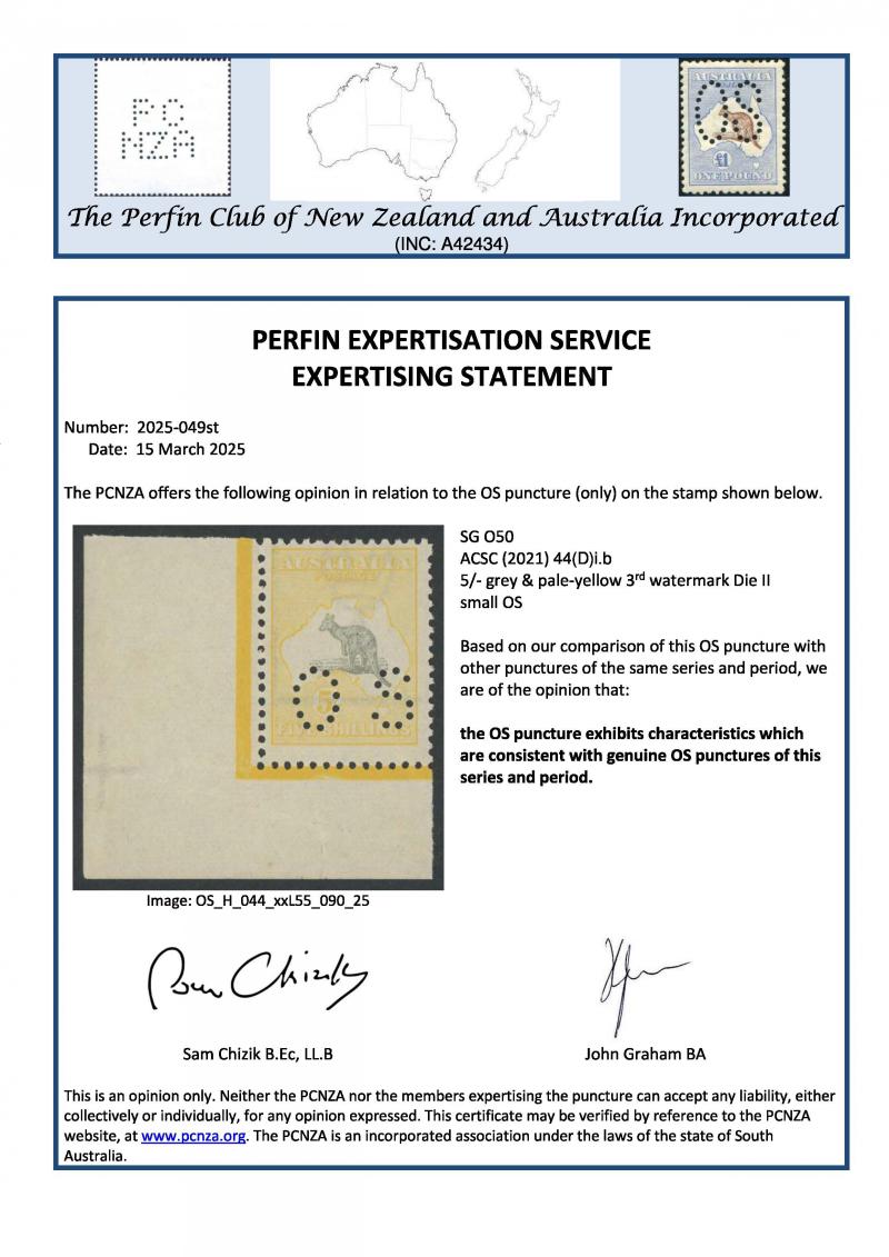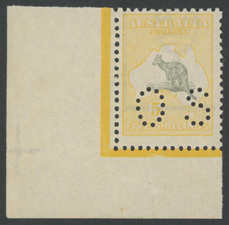 5/- grey and pale yellow ACSC 44Db (SG O50) marginal single from the lower-left corner of the sheet with Duty Plate variety Spencer