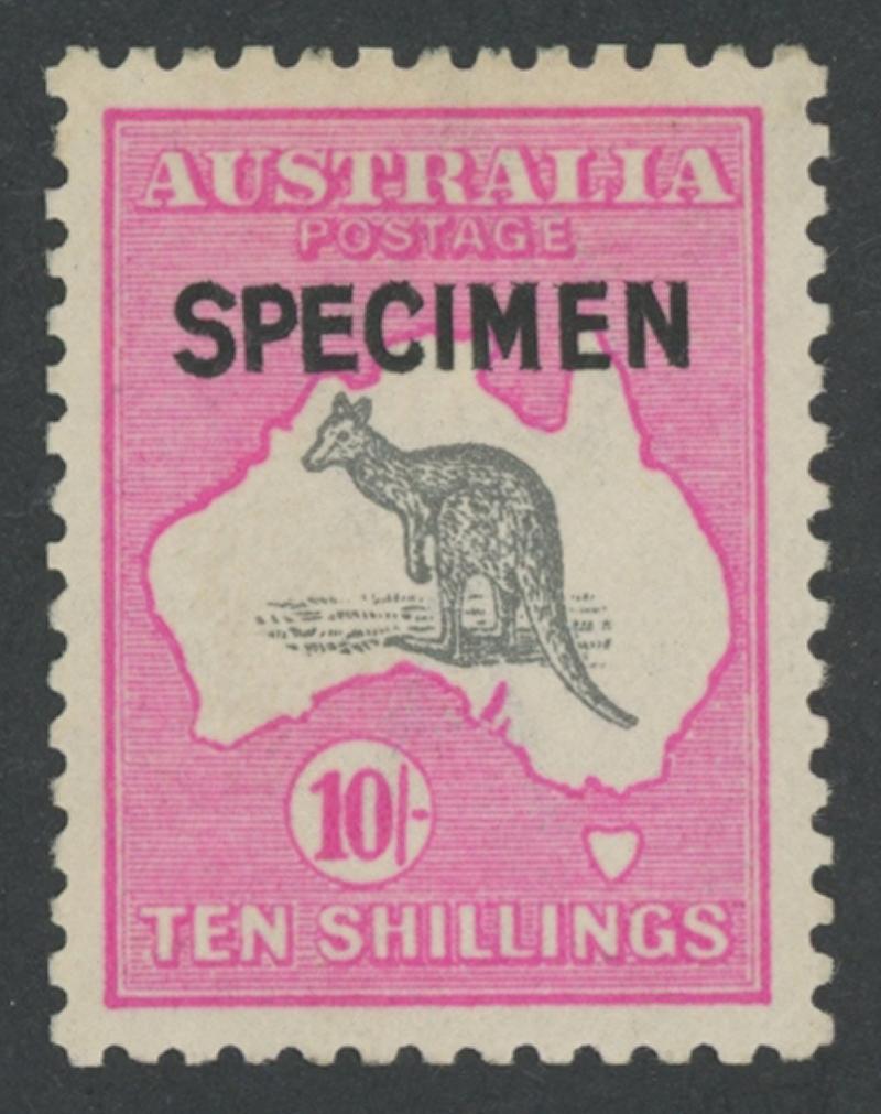 10/- grey and deep aniline pink SG 43a Type B 'SPECIMEN' Overprint ACSC 48Bx, well-centred and lightly mounted, Cat $600. (Image1) (Image2)