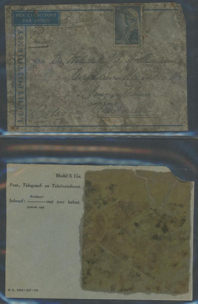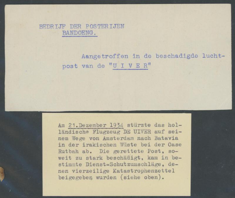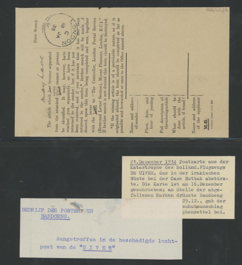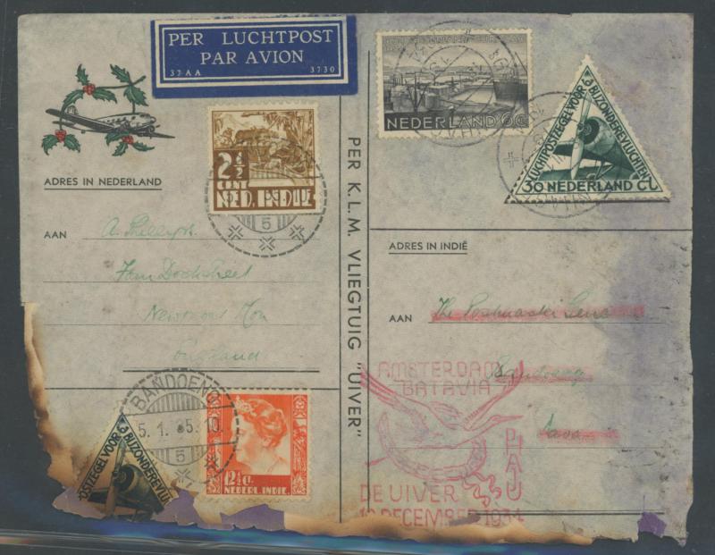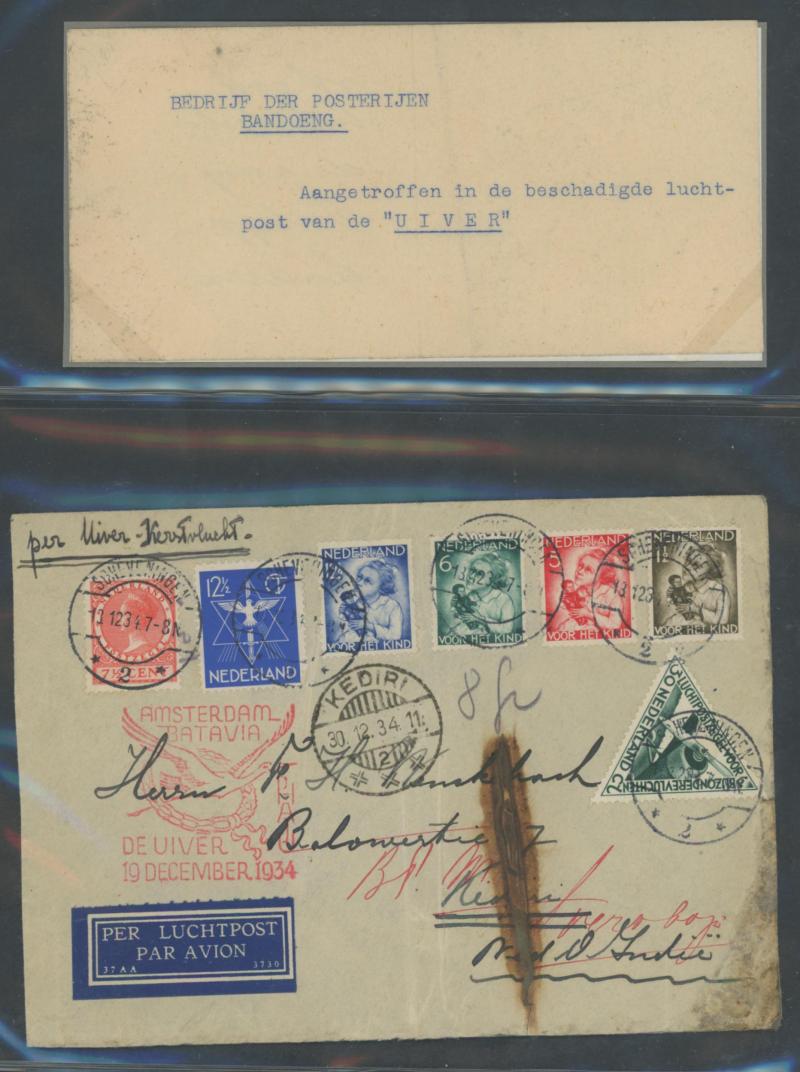 Christmas wreath]/DE UIVER/19 DECEMBER 1934' cachet in rosine, a good range of Dutch frankings & postmarks, all recovered from the crash-site near Rutbah Wells in Iraq in which all occupants were killed, eight with little or no damage, nine with