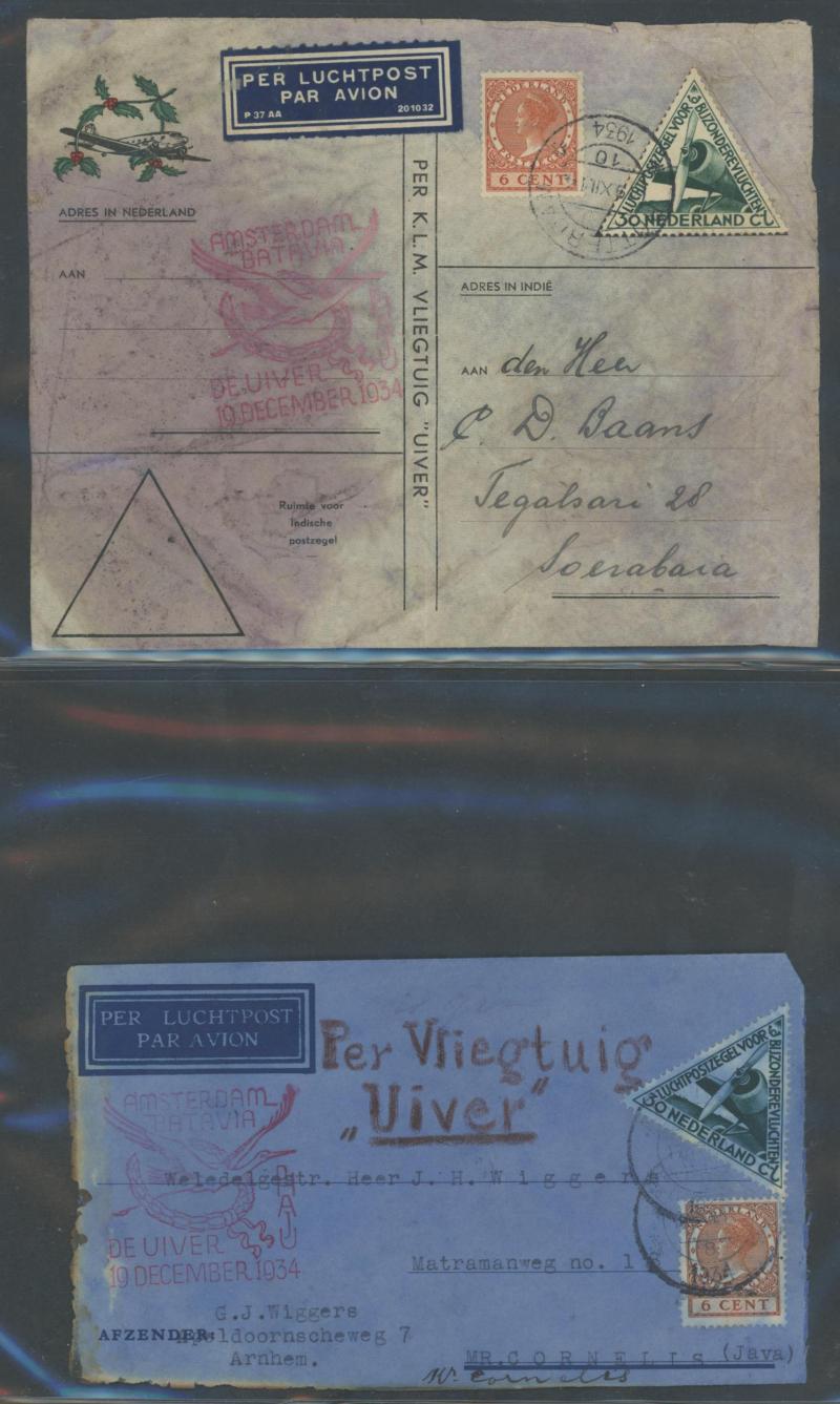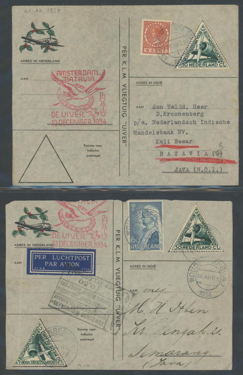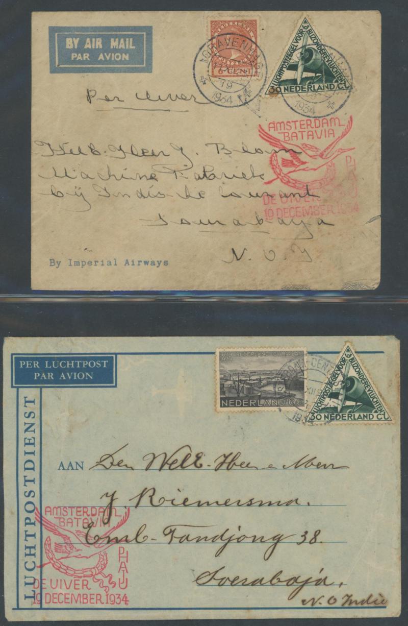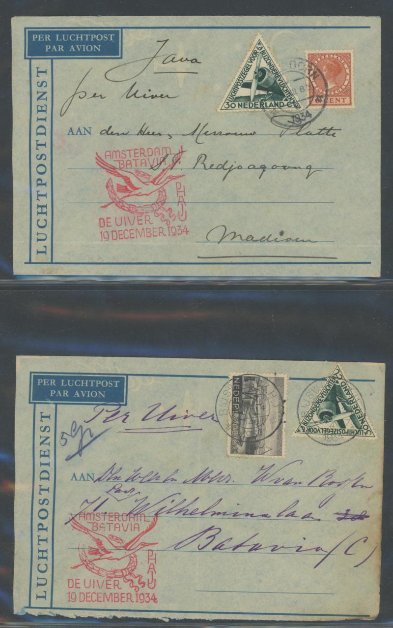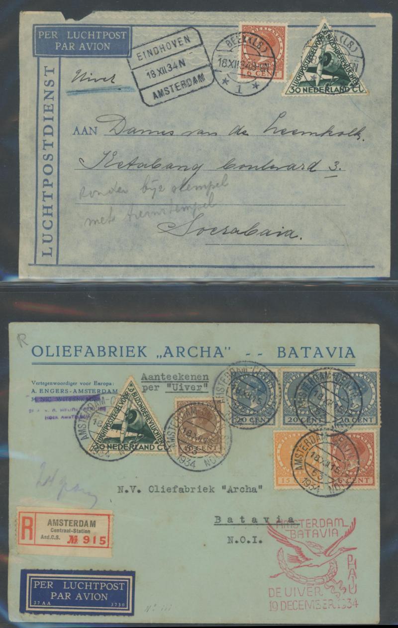POSTAL HISTORY: (Dec) mostly commercial or social airmail covers per 'Uiver' (= stork) all with 'AMSTERDAM/BATAVIA/[stork &