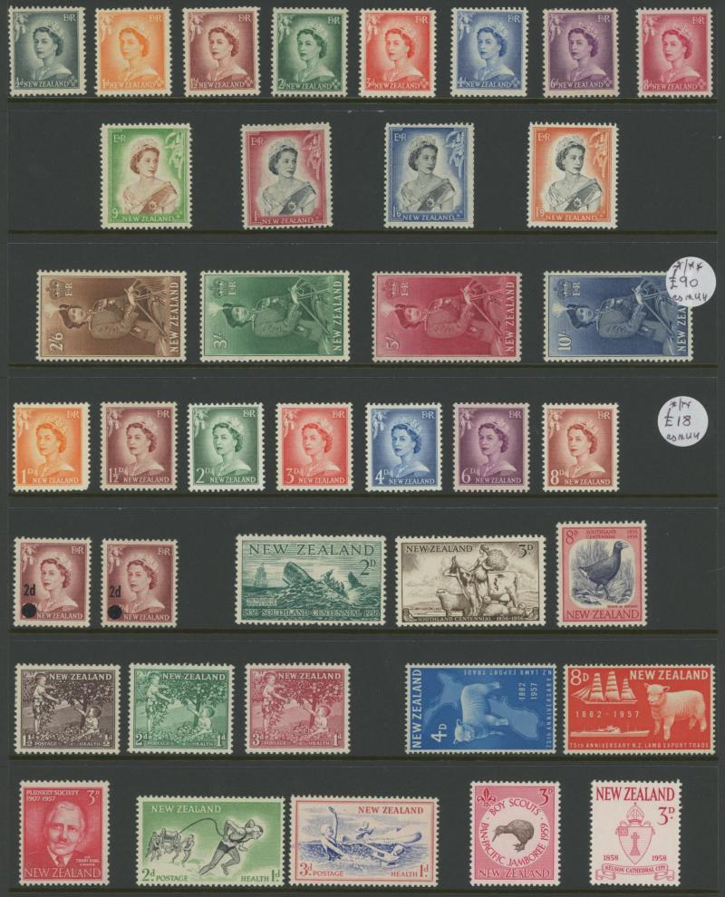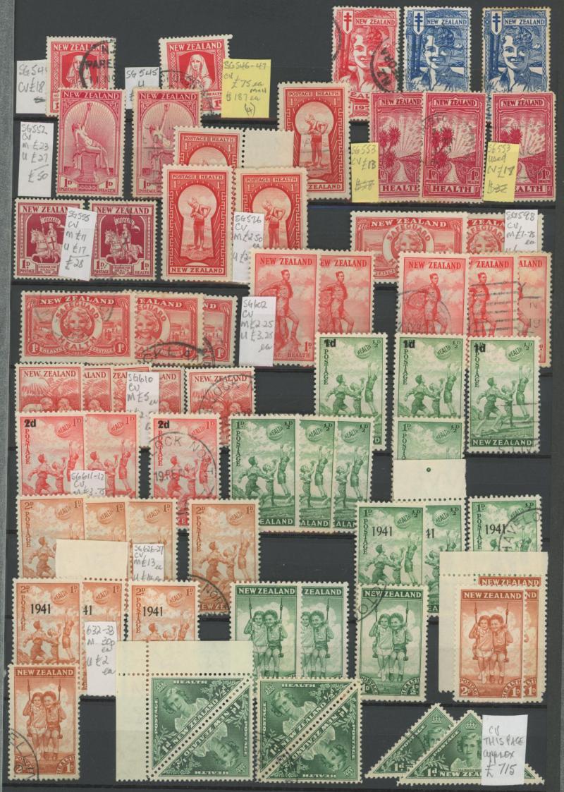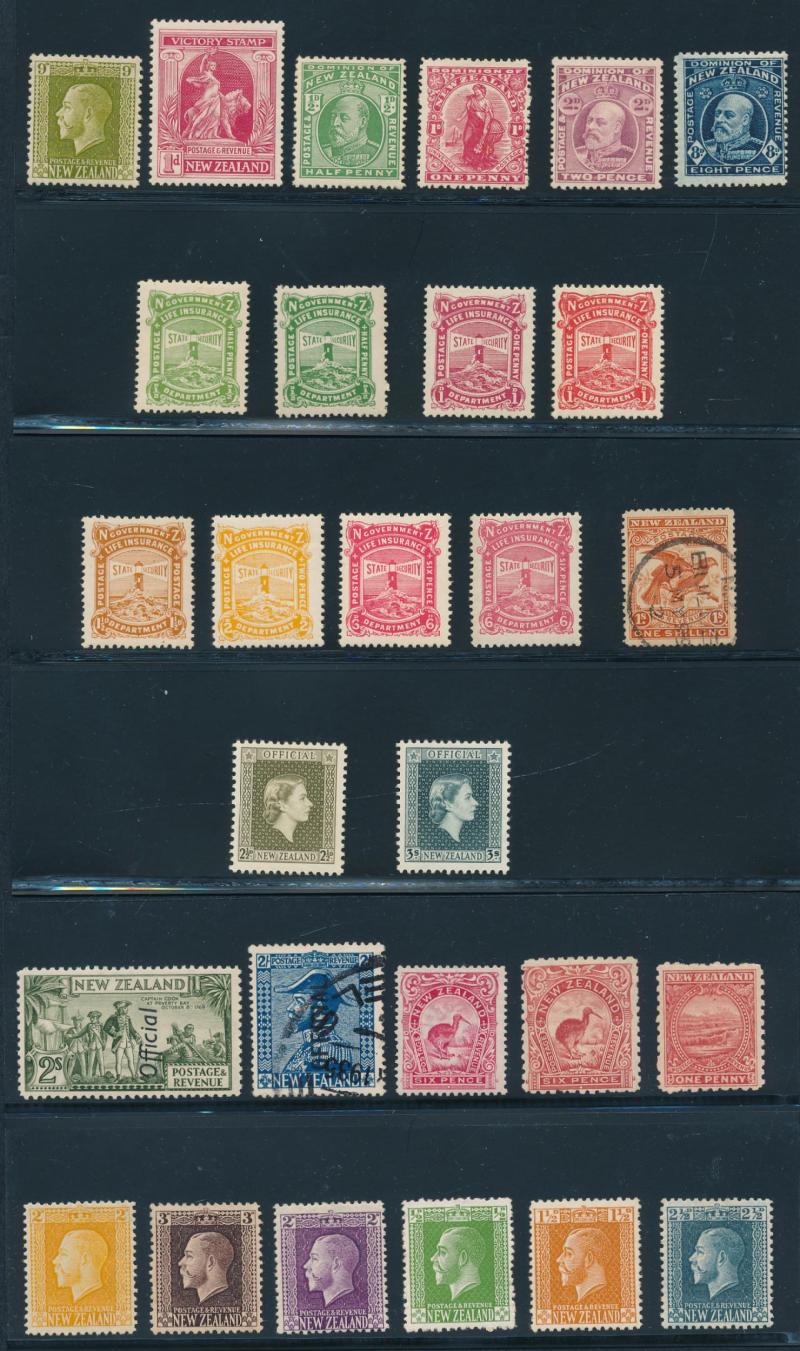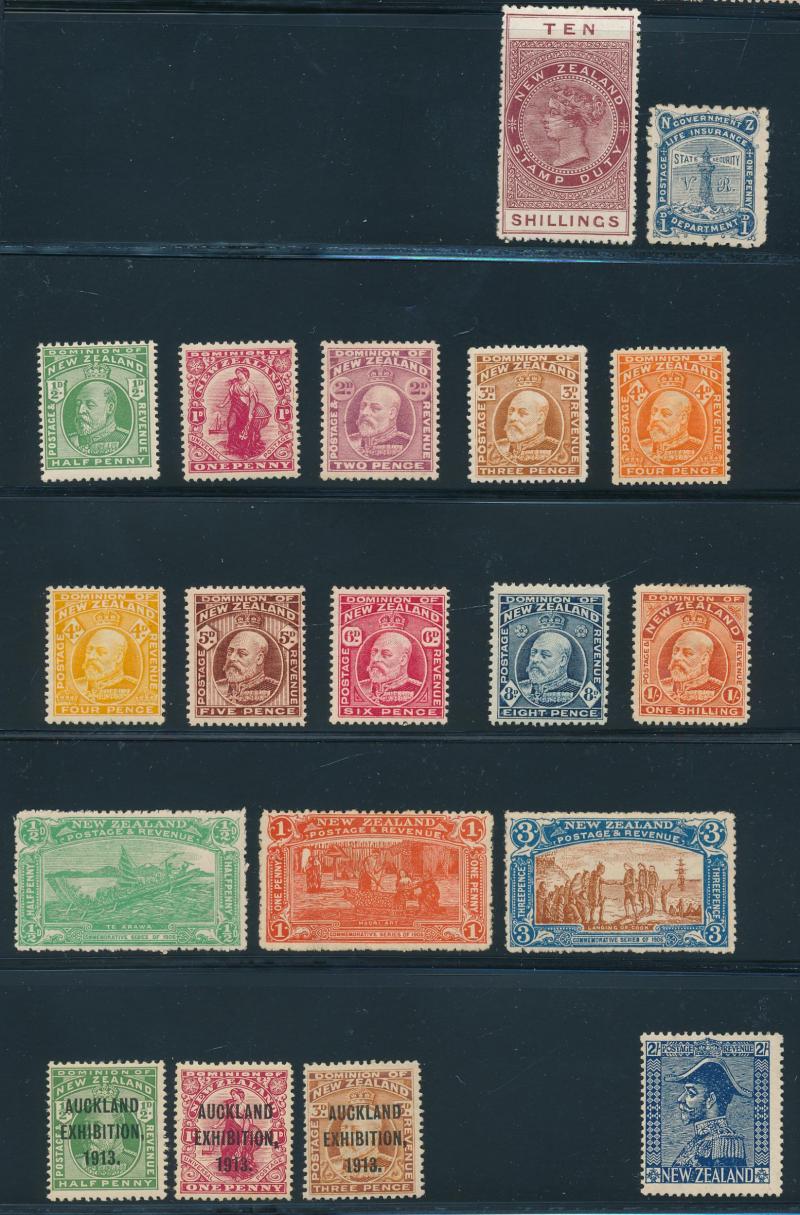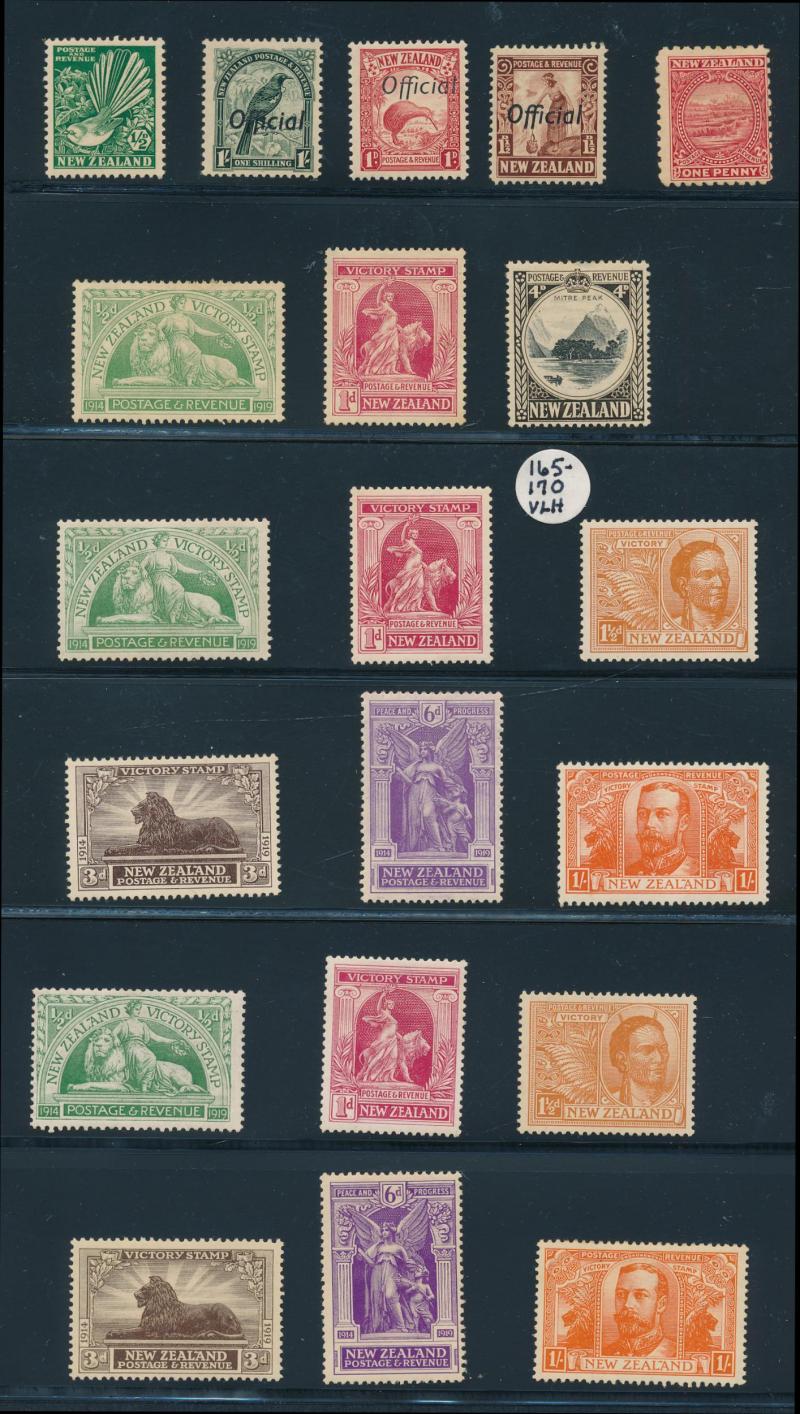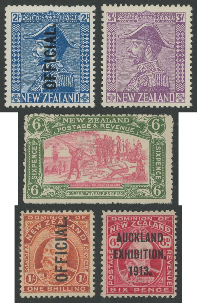 Christchurch Exhibition set, 1909 KEVII set plus 1/- 'OFFICIAL' overprint, 1914 Auckland Exhibition overprints set, 1915-33 KGV Heads range, 1919 Victory set x2, 1926-34 KGV Admiral 2/- & 3/- plus 2/- 'OFFICIAL' overprint, 1935 Pictorials 2/- Cook