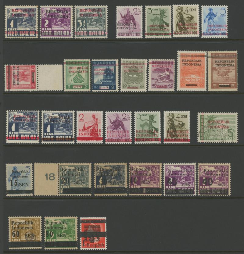 overprints), on Japanese Occupation of Java First Anniversary 3½c carmine & 5c green used and on Pictorials set **, and Sumatra 'Repoeblik/Indonesia' Surcharges on Netherlands Indies set SG J1-22 and S1-S7 & S8-S10, the mint unmounted some with minor