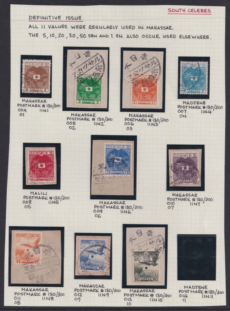 JAPANESE OCCUPATION: 1943 Flag 2c to 1g SG 152-162 all used in the South Celebes (Sulawesi) mostly with Macassar Japanese character