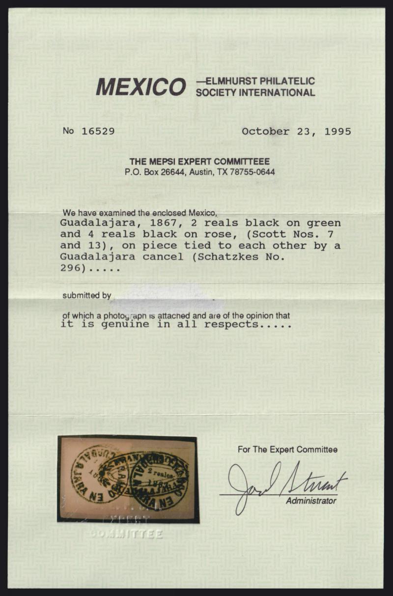 Quadrillé Paper Imperforate 2r black/green SG 9A (Scott 13), both cut-square with margins close to large, on-piece tied by very fine complete 'FRANCO/GUADALAJARA' undated oval cancel, Cat £134 (US$320). MEPSI Certificate (1995). (Image1) (Image2)