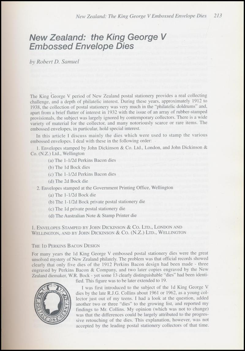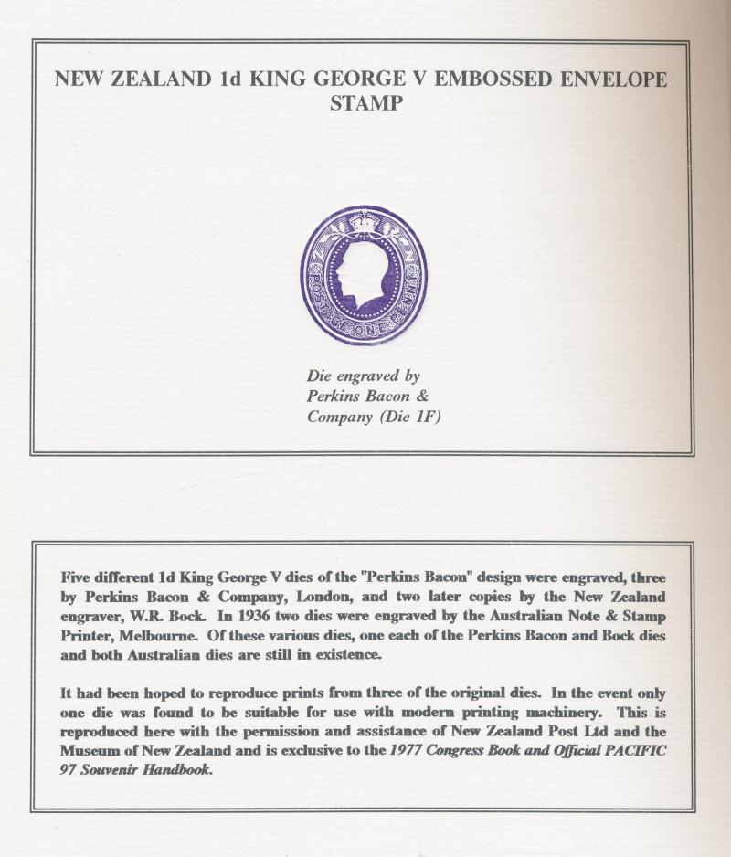 technical information tacked-in as page 212 of the Pacific 97 (San Francisco) Congress Book to accompany 15pp specialised article "The KGV Embossed Envelope Dies" by Robert Samuel. Superb. Available only in this format. (Image1) (Image2)