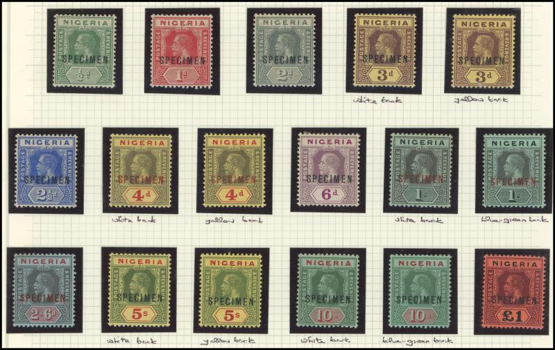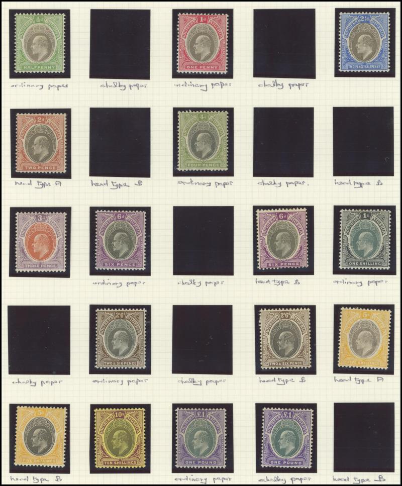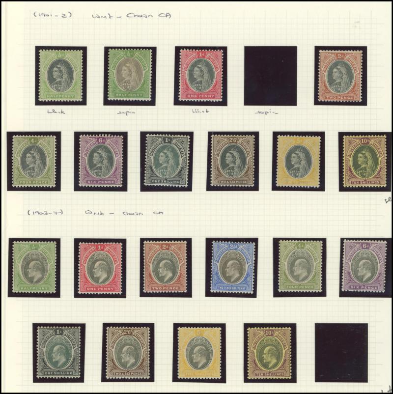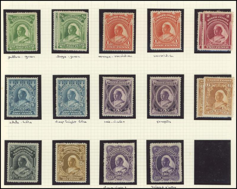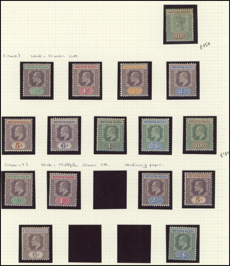 complete including extra shades noted Crown CA Wmk 10/- violet x3, Northern Nigeria resonably complete including QV 10/- x2 plus QV 'SPECIMEN' overprints set (ex 10/-), Southern Nigeria 1901 QV set plus 'SPECIMEN' overprints, 1903-04 KEVII Crown CA